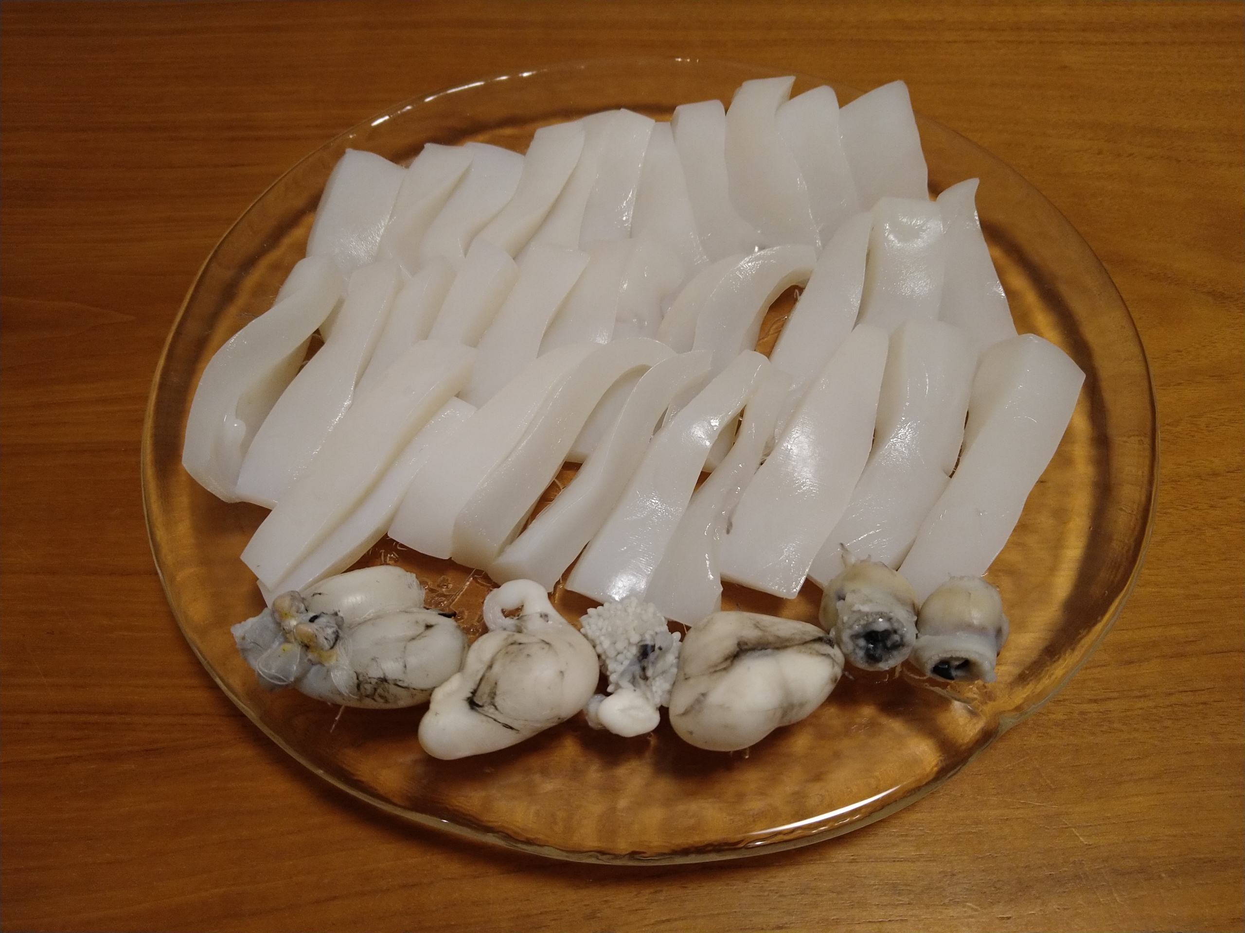 さばいて身は刺身に内臓の白子・卵・口等は湯引きにしました。身は肉厚で甘味が強く少しねっとりとしていてメチャ美味しいです。内臓も部位ごとに食感が違いイカの旨味があって美味しかったです。