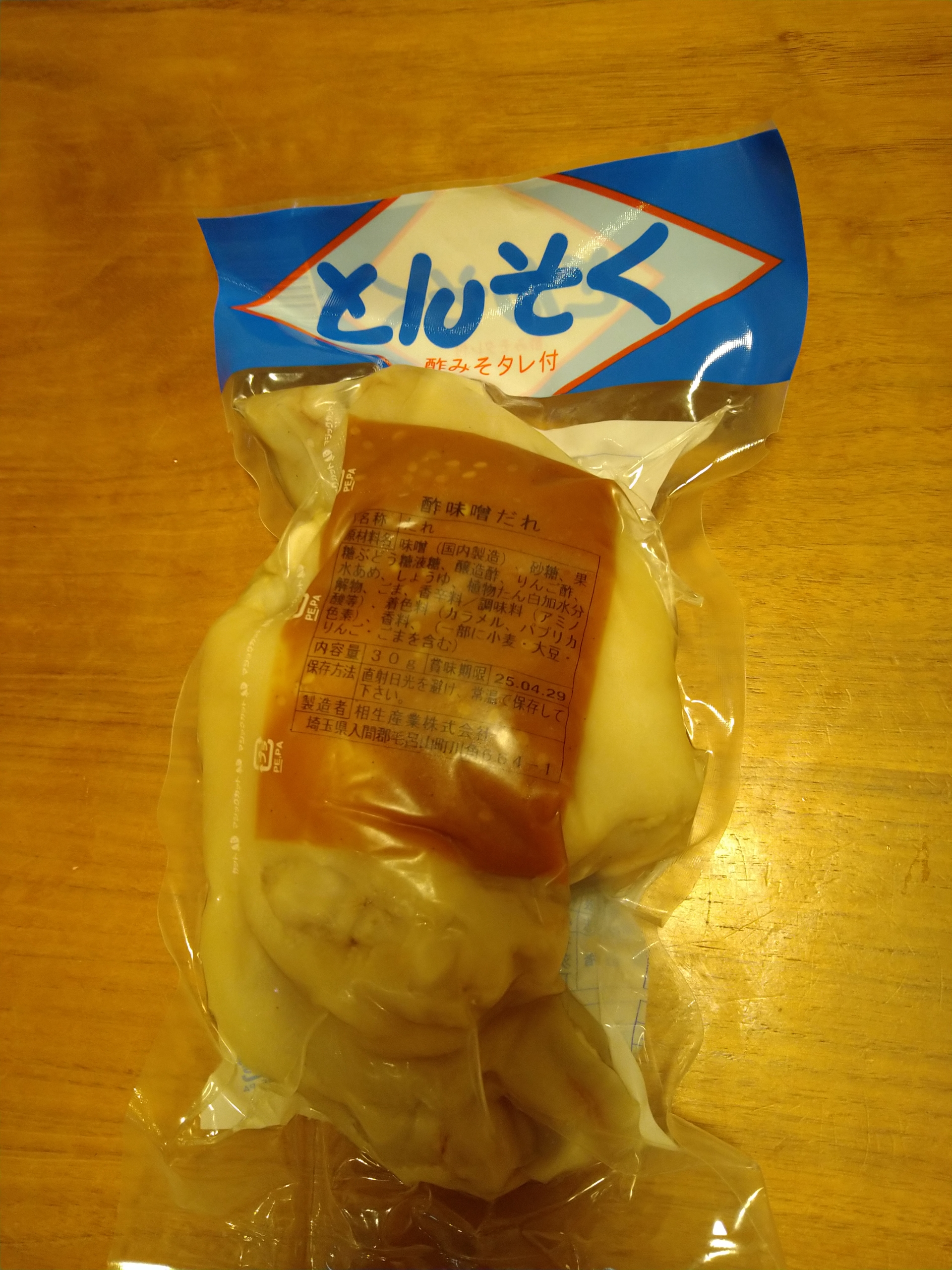 袋から取り出してレンチンして付属の酢味噌に付けて頂きます。食べた感想はちょっと筋の部分がガリガリと硬いですが、酢味噌で食べるとサッパリとして美味しかったです。歯の間に嚙み切った筋が挟まるのがネックですが・・・