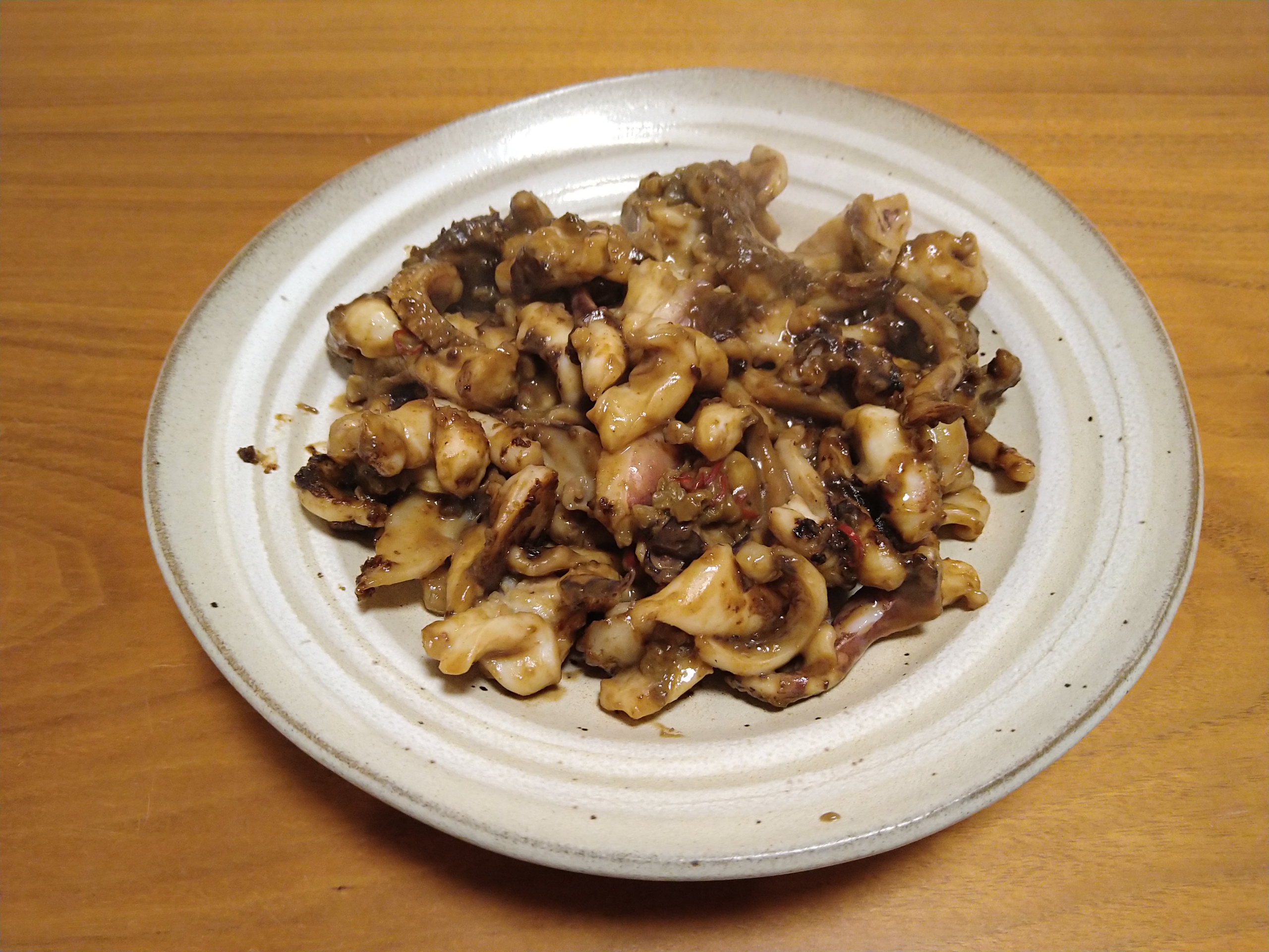 肝(肝臓)とゲソ・耳は油で炒めて肝醤油炒めを作りました。肝の濃厚な旨味があって美味い!酒が進むみますねぇ〜