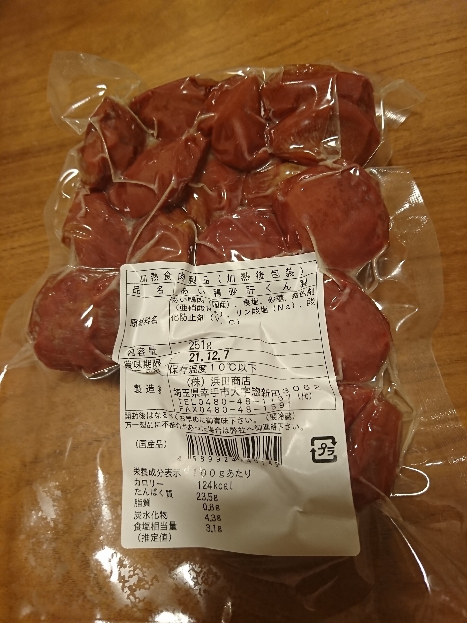 今日の酒の肴は埼玉県幸手市の浜田商店の製造する国産合鴨の砂肝燻製です。
