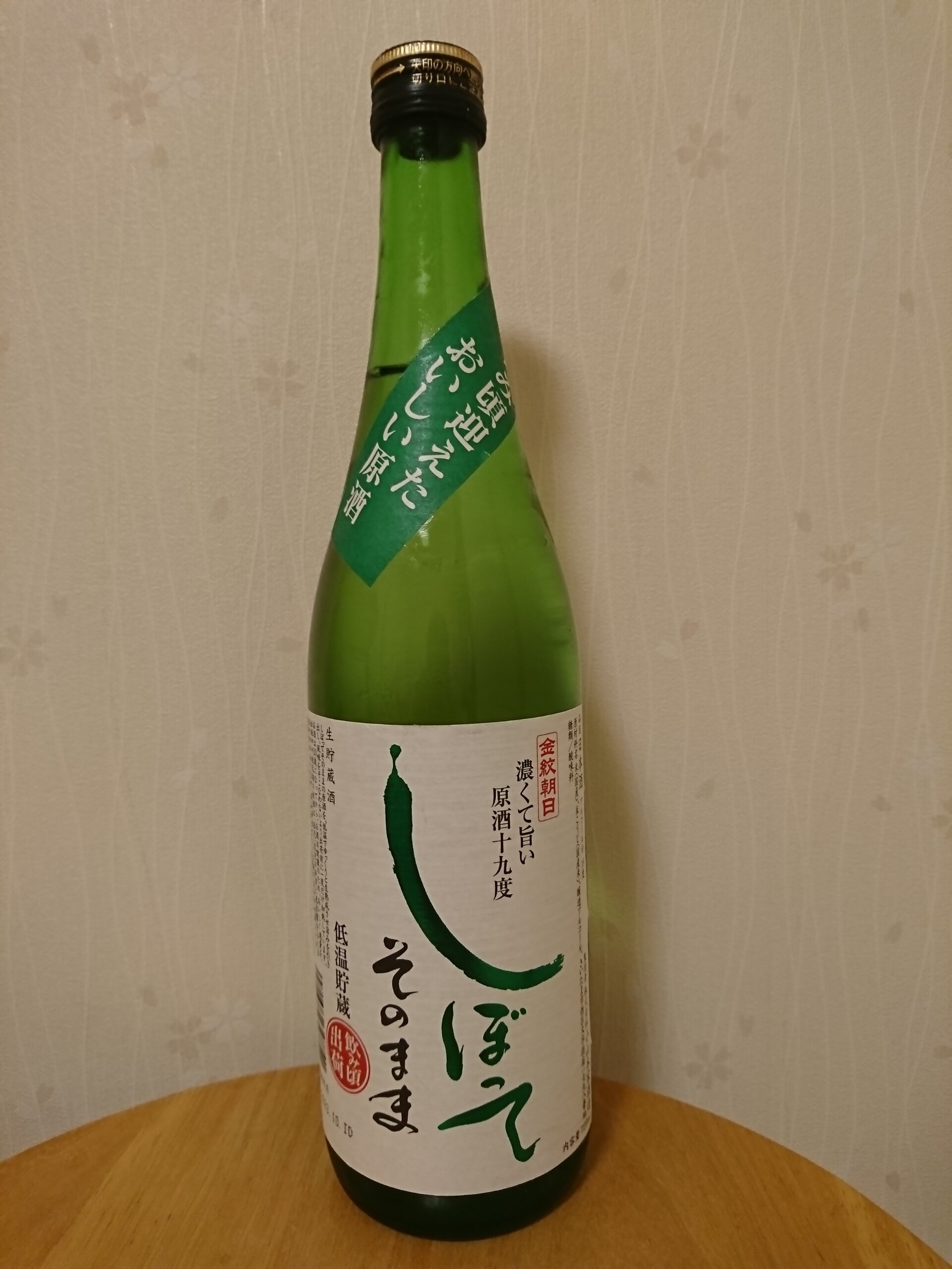 今日は茨城県取手市のディスカウントストア・ミスターマックス取手店で658円で購入した、埼玉県さいたま市の大手酒造メーカー・小山本家酒造の酒「金紋朝日・しぼってそのまま生貯蔵酒」を冷やして飲みました。酒は糖類・酸味料入りの糖類添加酒をしぼってそのままの原酒を飲み頃まで低温貯蔵した物で、アルコール度数は19度台と糖添酒の原酒としてはややアルコール度数が低い感じがします。飲んだ感想はとろっとしたとろみのある濃醇甘口の酒で飲み込むと少しアルコール辛さがありますが、まろやかで飲みやすく19度のアルコール度数を感じさせない飲み口でゴクゴクと飲めてしまいます。糖類・酸味料入りの酒ですが、しっかりとした旨味があって値段もお手頃でとても美味しかったです。これは◎