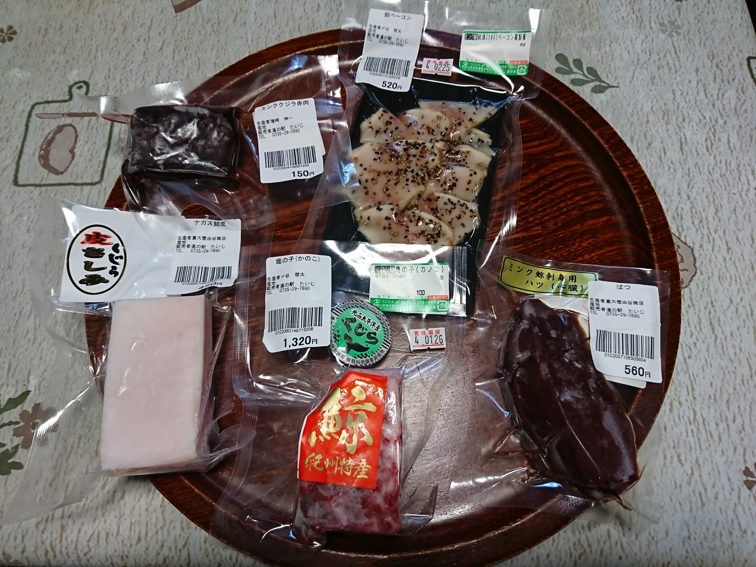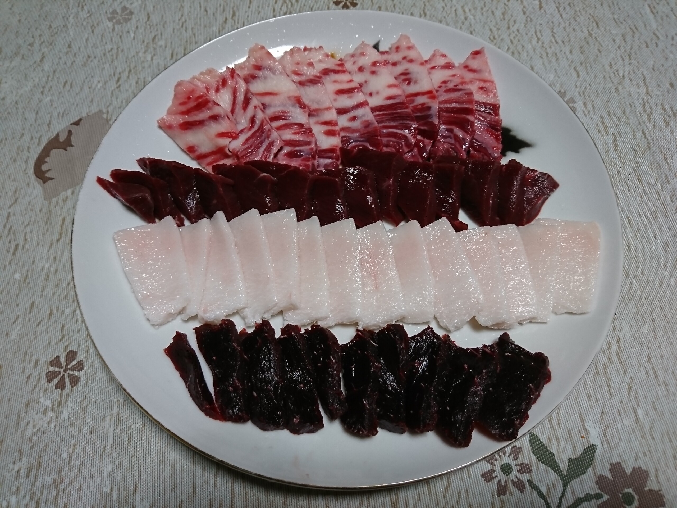 今日の酒の肴は鯨づくしでミンク・ナガス・イワシ鯨の各部位の刺身です。部位は鹿の子・ハツ・赤身・本皮・ベーコンです。