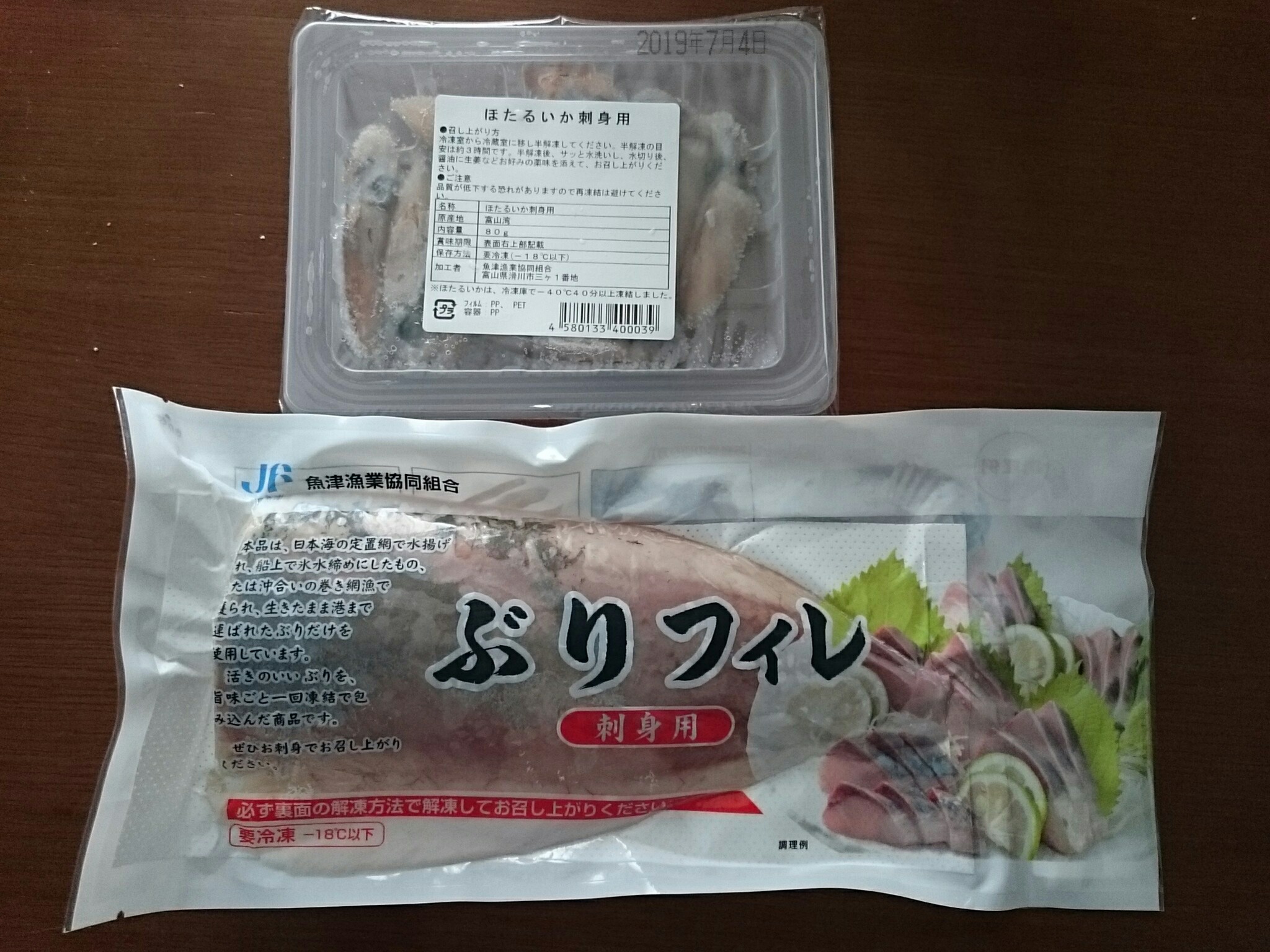 今日の酒の肴はよつ葉生協で購入した、富山県の魚津漁業協同組合の刺身用のぶりフィレとホタルイカです。