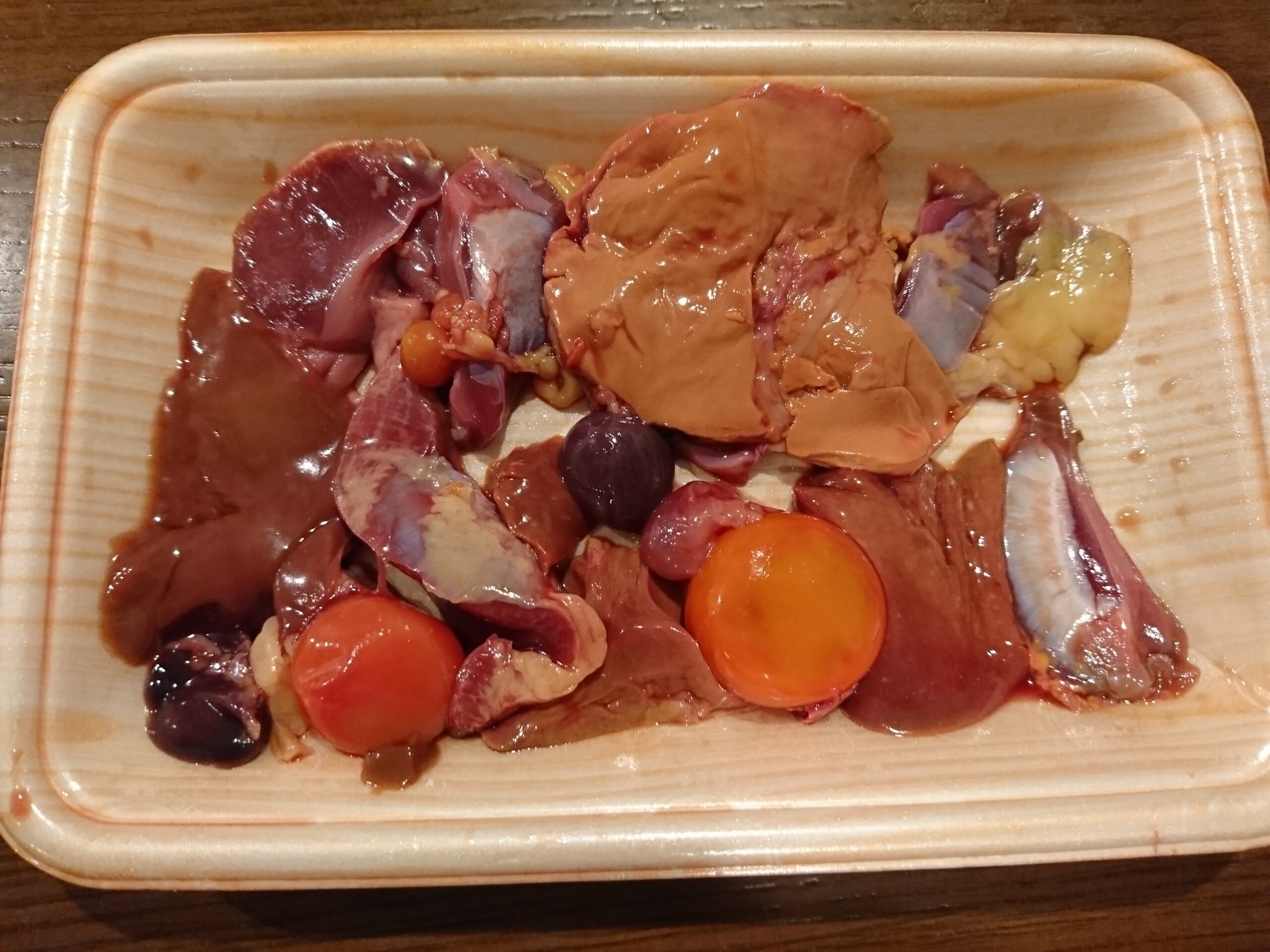 しゃも(軍鶏)を1匹分さばいた内臓なのか・・・?レバーや砂肝・きんかんを始めいろいろな部位が入っていました。