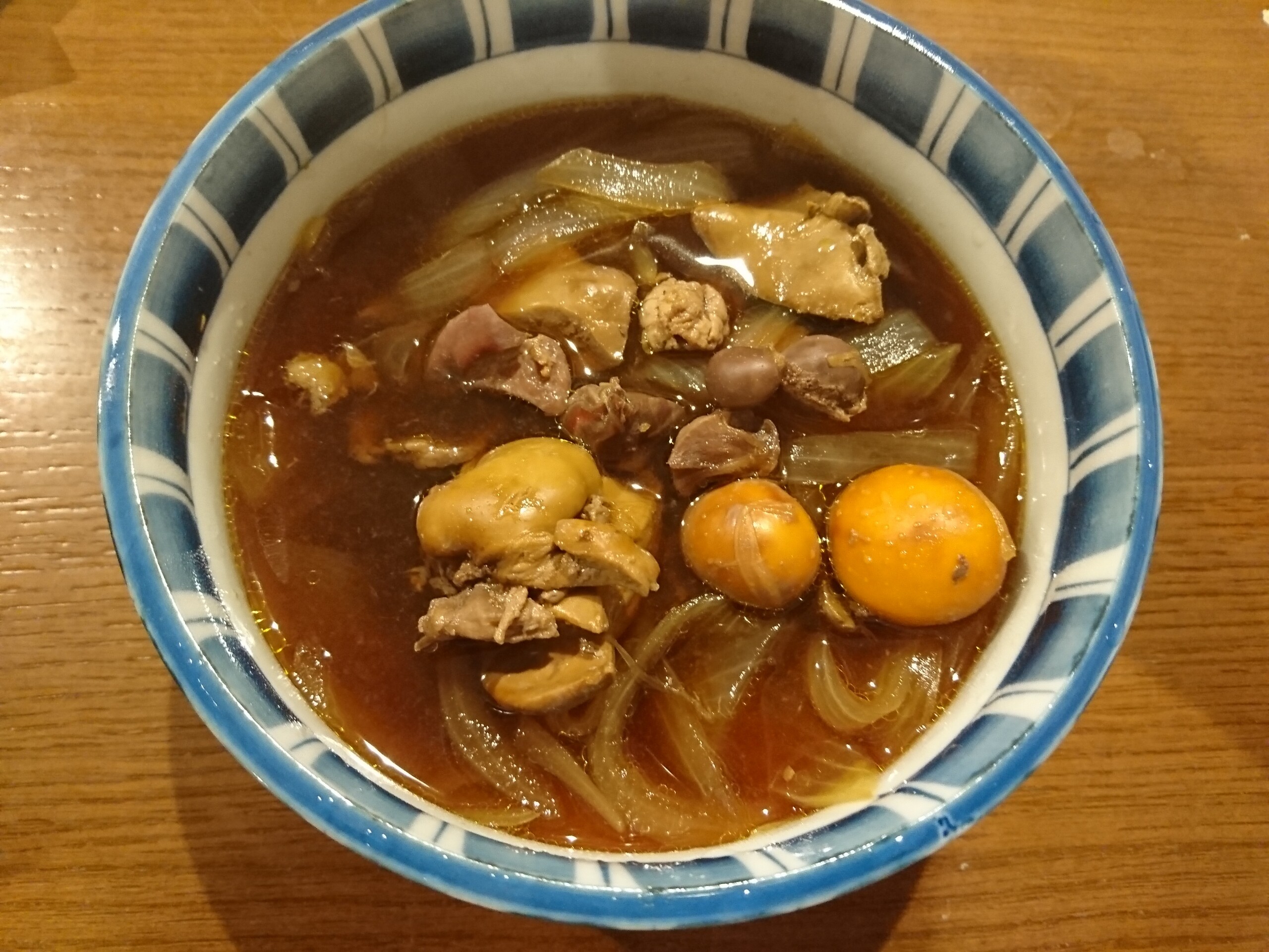 酒の肴に作ったのは、しゃもの内臓に玉葱を入れて、醤油・酒・味醂・生姜で味付けをして煮込みにしました。しゃもの内臓は少し癖がある様な感じがしますが、濃いめの味付けをしたので結構美味しく食べれました。