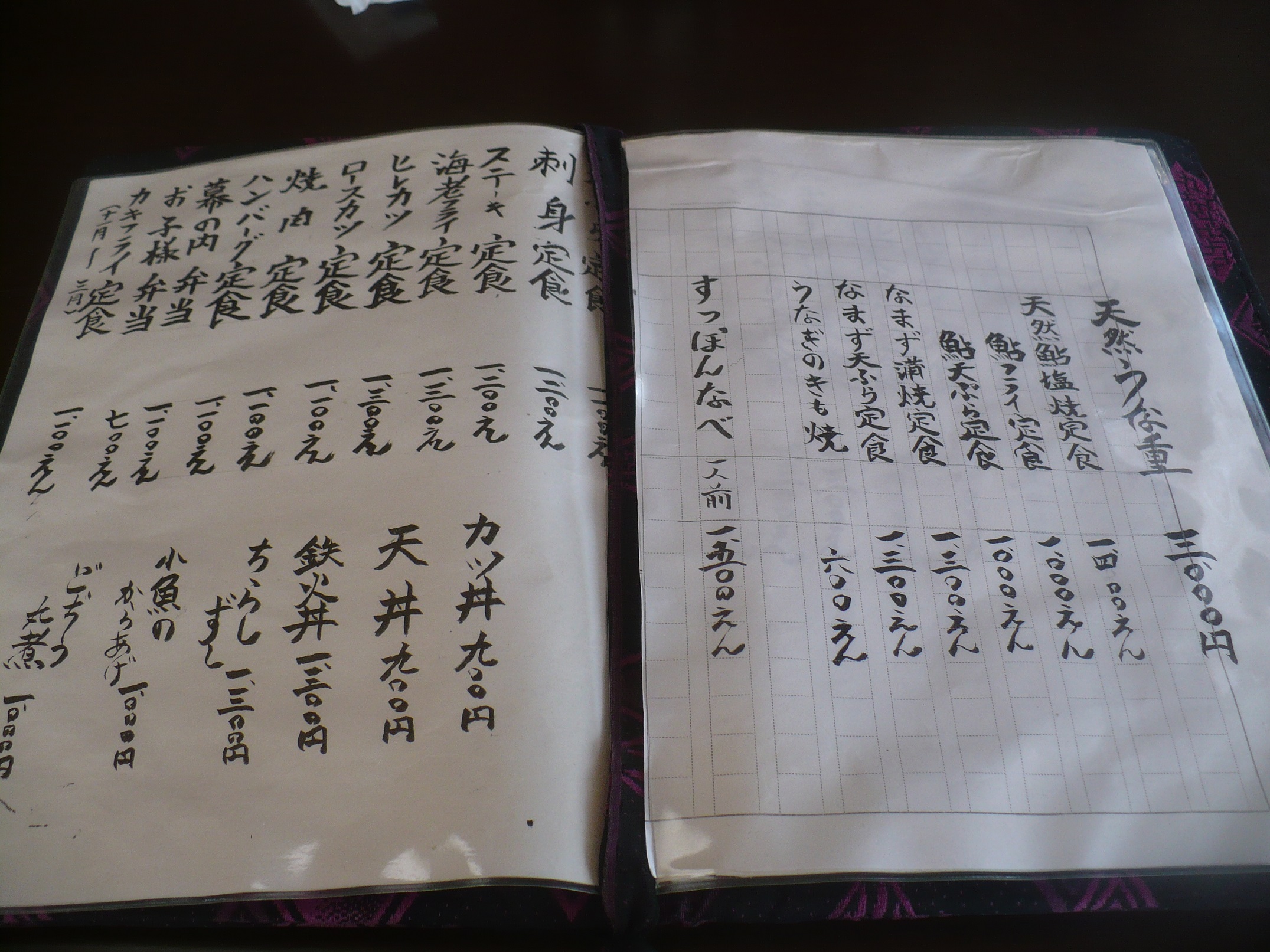 お店のメニューです!鰻・鮎・鯰の他にカツ丼や焼肉定食などの一般的なメニューもあります。