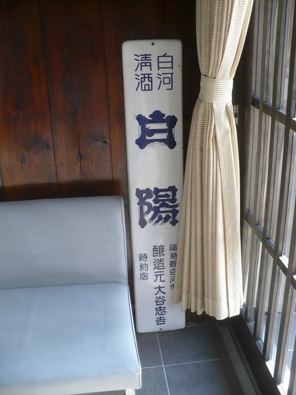 酒蔵の売店に置かれていた白陽の琺瑯看板です。風雨にさらされてないから綺麗ですね。