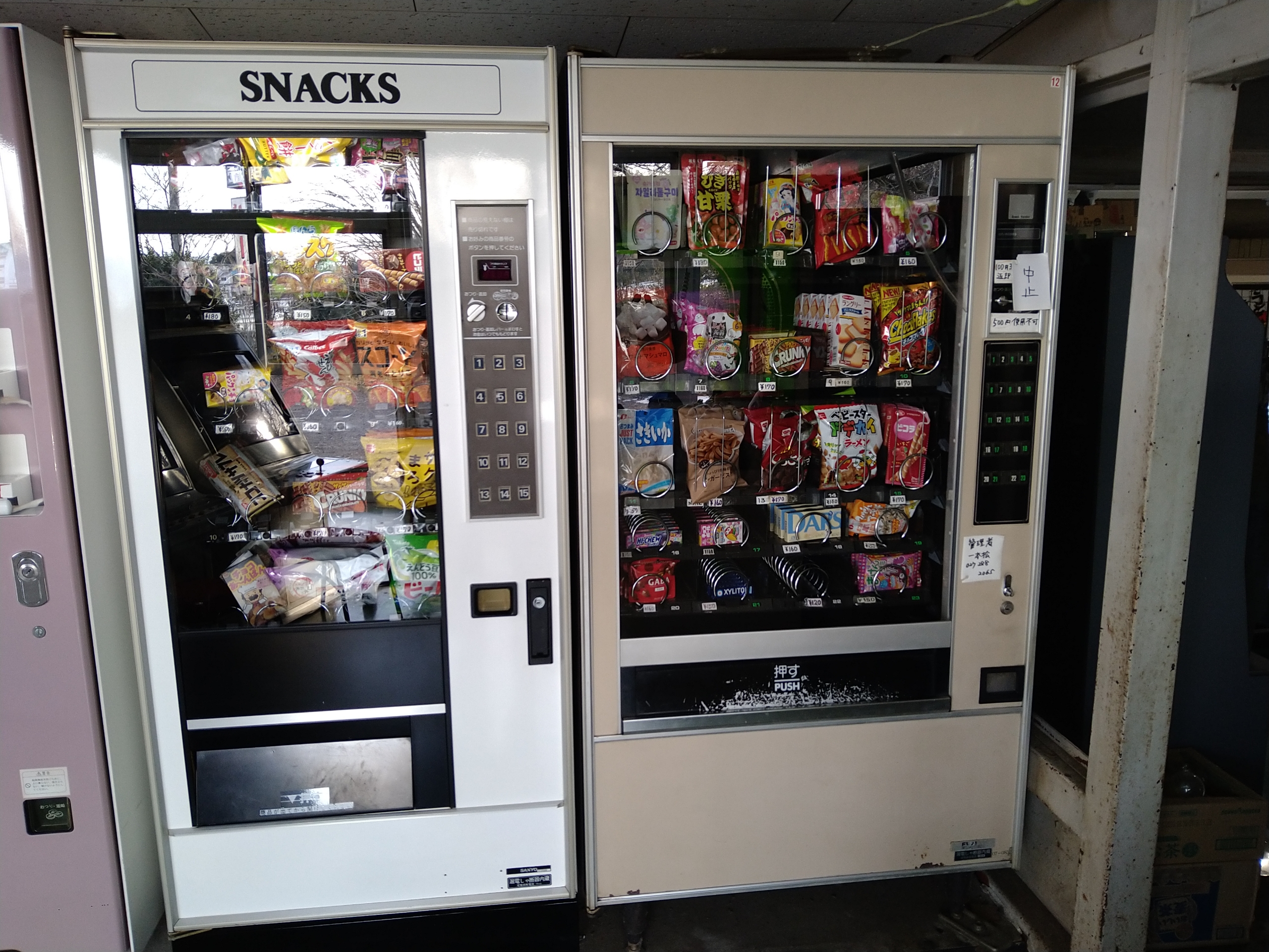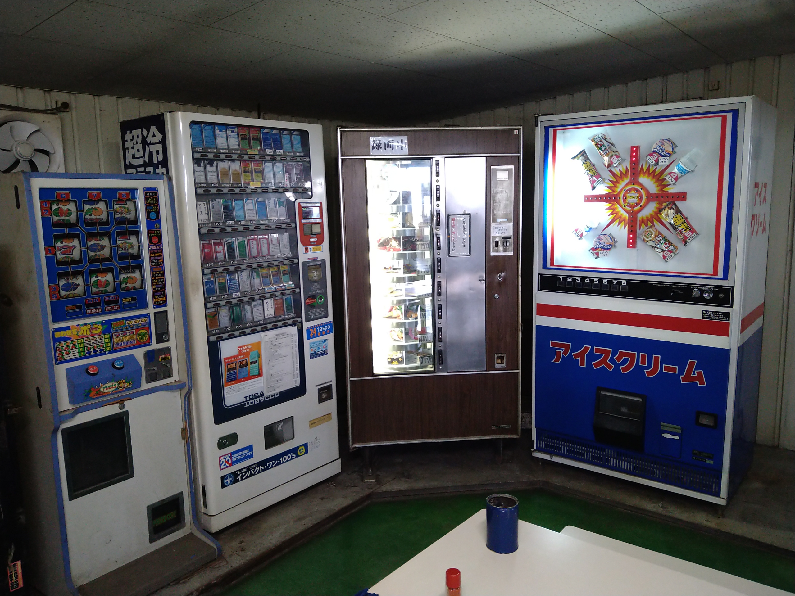 懐かしい当たり付きのアイスの自販機も現役稼働中〜 真ん中の茶色い冷蔵タイプの古いレトロ自販機には生菓子系のスイーツが売られていますが、店主の話では古い自販機なので価格設定が個々にできない為、値段がオール170円らしいです。