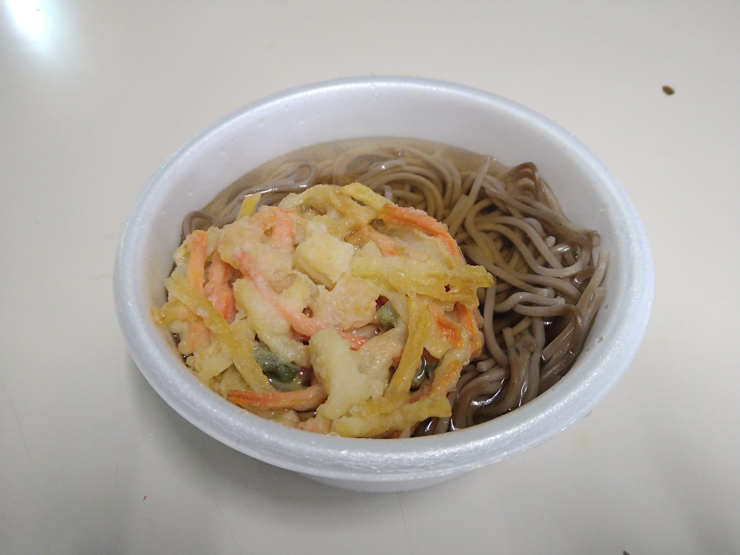 今回食べたのは天ぷらそば(350円)です。つゆから飛び出してる部分の蕎麦の色が変わっていますね。蕎麦が乾いて硬くてパサパサでした。でも普通に美味しくイカ入りのかき揚げも美味しかったです。
