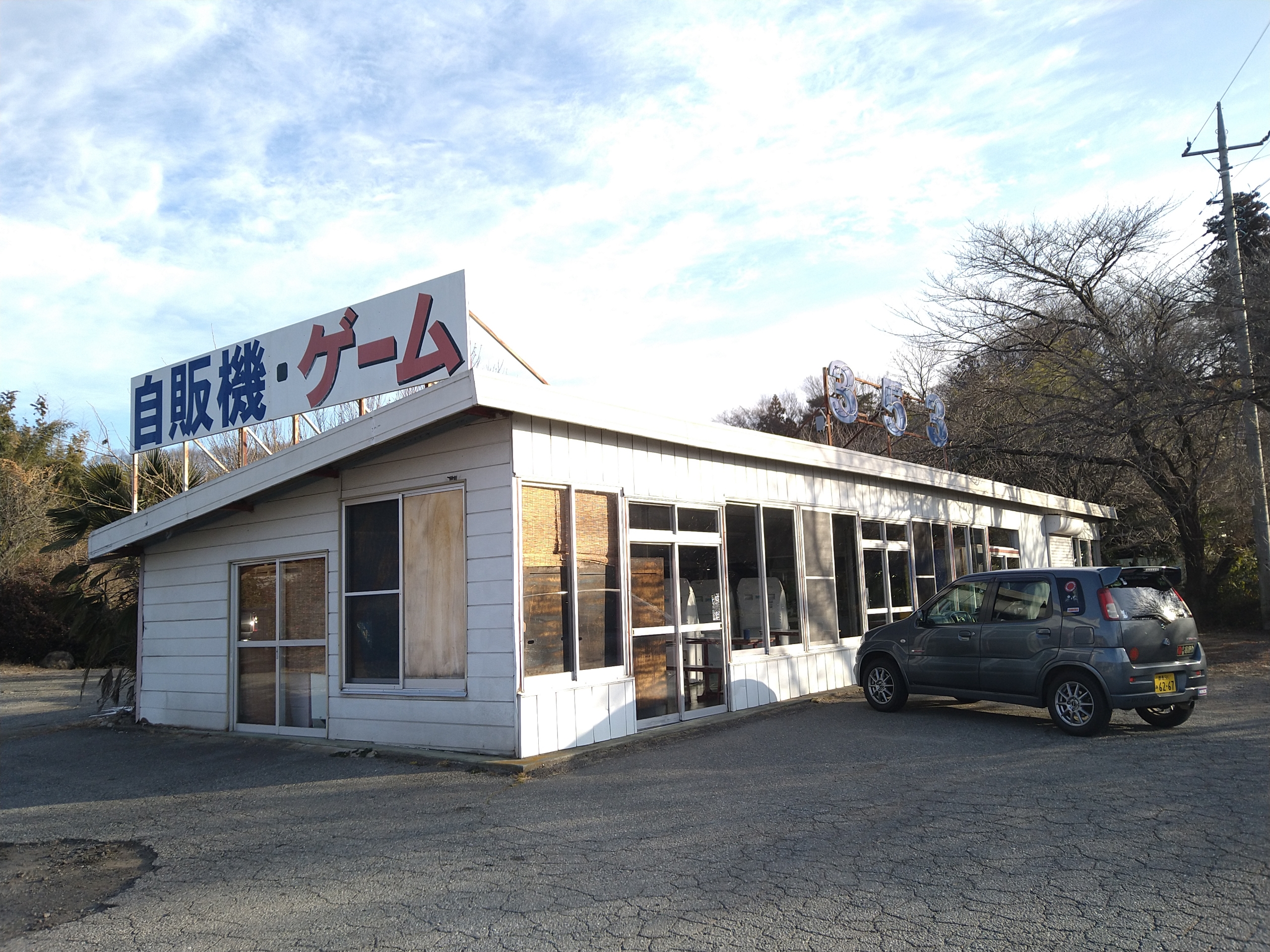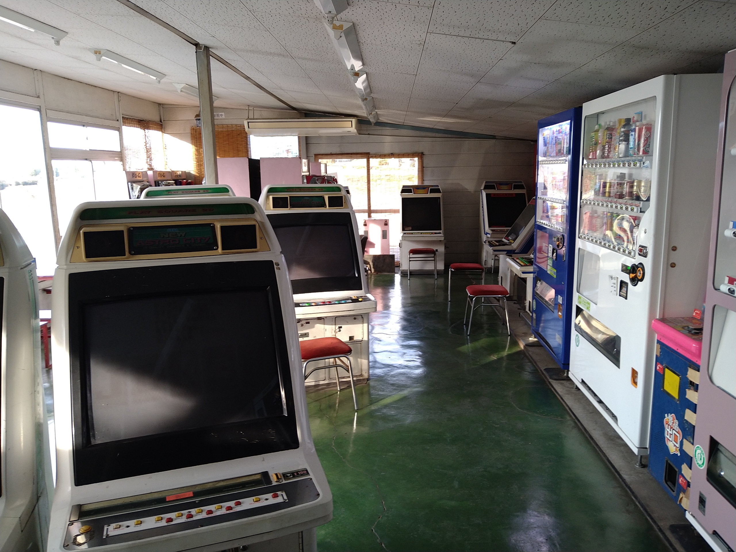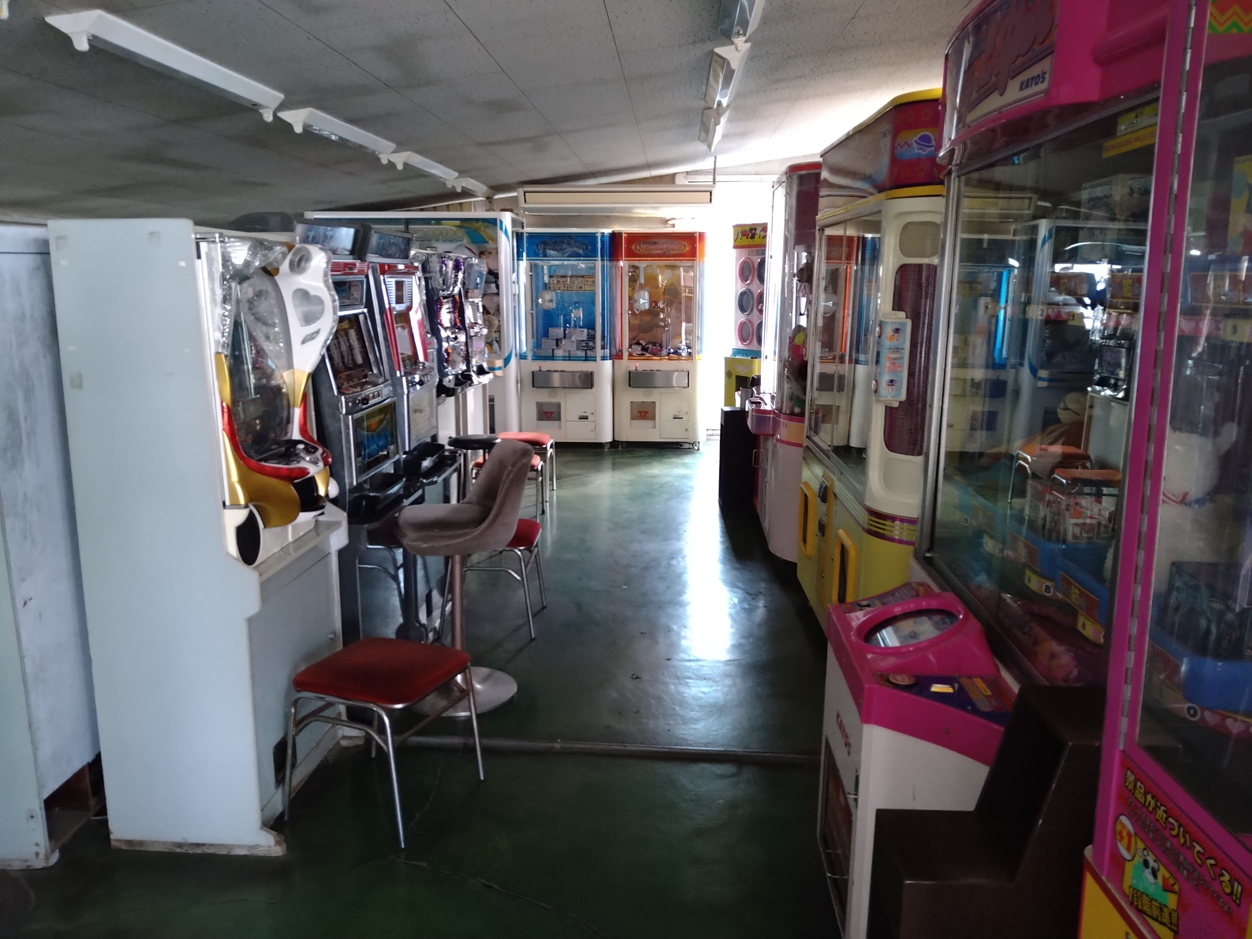 店内はプレハブ調の簡易的な建物です。入口付近には麻雀などのビデオゲームの筐体がありました。