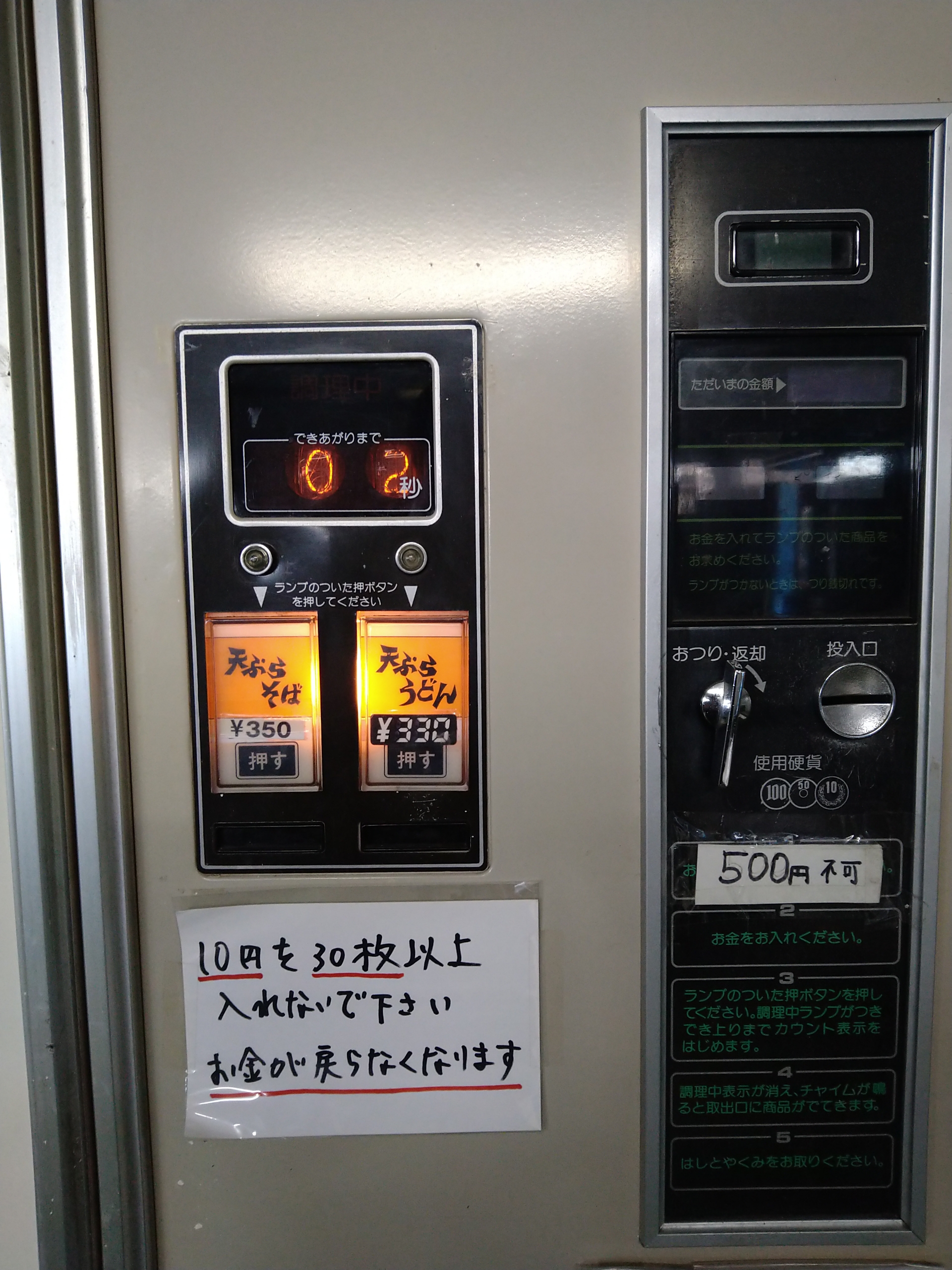 そしてありました!オレンジ353の稼ぎ頭で富士電機製のうどん・そばのレトロ自販機!その横には後継機とも言える同じく富士電機製のカップラーメンの自販機がありました。