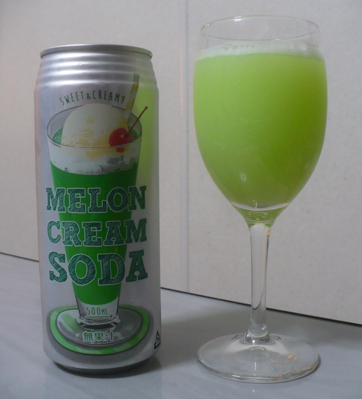 グラスに注ぐとこんな感じで、鮮やかな黄緑色をしています。原料に合成着色料の黄4と青1が使われています。飲んだ感想はやや炭酸の効いた甘ったるい味わいで、香料の香りがプンプンしていて安っぽい味ですが、どこか昔懐かしい感じがして美味しかったです。でも美味しく飲めるのはグラスに1杯くらいですね。甘さと香料がきつくて飲んでてだるくなってきます。これは500mlじゃなくて250mlくらいで販売してくれたらちょうど良いのになぁ〜
