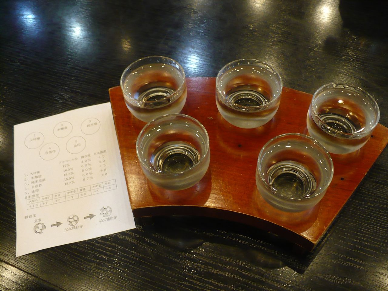 最初に注文した酒はきき酒セットAの5種・600円で、種類は大吟醸・本醸造・純米酒原酒・自信作(普通酒)・金印(糖添酒)です。どれも結構美味しい酒でこの量で600円は安い!