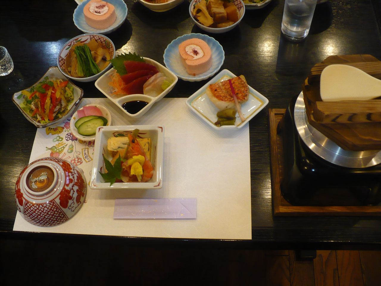 料理は2000円の京膳を食べました。2000円で料理が11品も付いて豪華です!イトヨリっぽい焼魚とその横に付いてたタラの芽がとても美味しかったです。