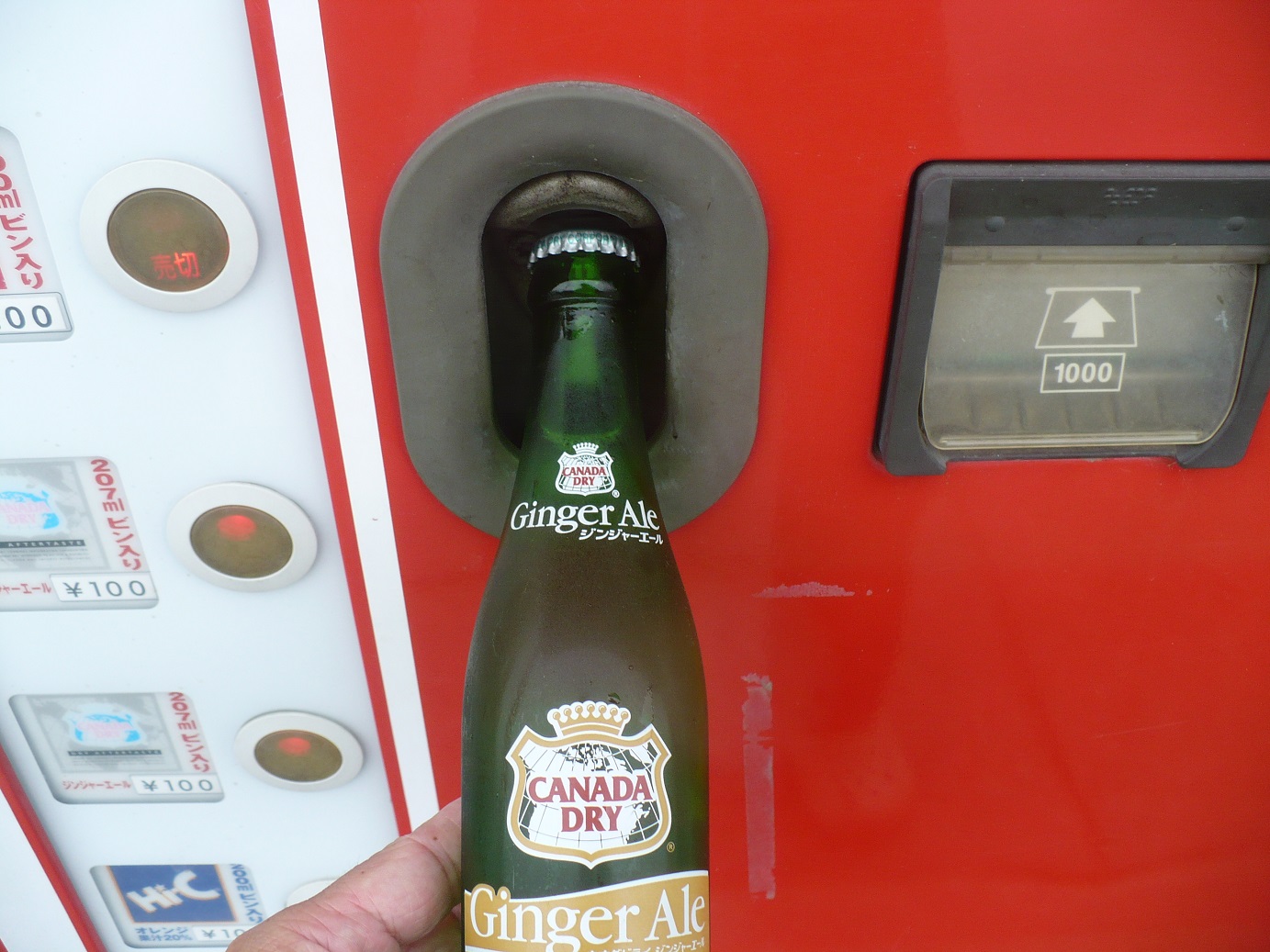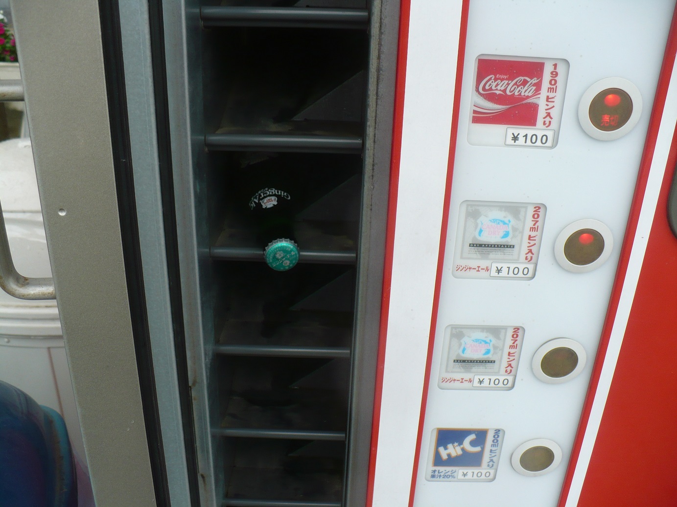 ビンコーラって炭酸が缶やペットボトルのコーラより効いてて美味しいですよねぇ〜 でも残念な事にコーラは全て売切れ 仕方ないのでコーラの次に好きなジンジャーエールを買いました!値段はワンコインの100円〜