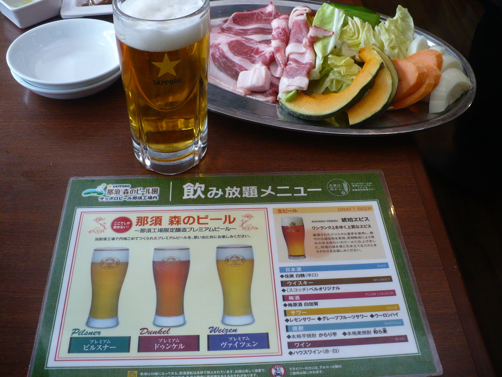 今日は昼食に那須町にあるサッポロビールの「那須・森のビール園」に行きました。ここはバイキング方式でいろいろな料理を食べながら、サッポロビール那須工場限定醸造のプレミアムビールを楽しむ事ができます。