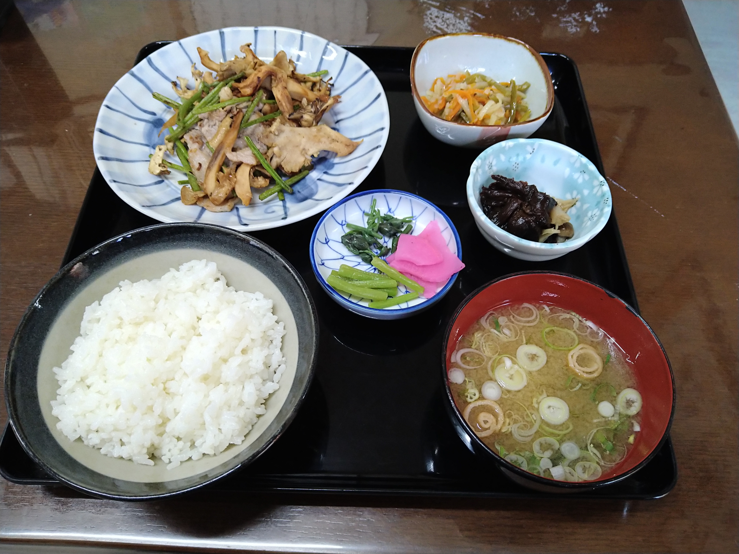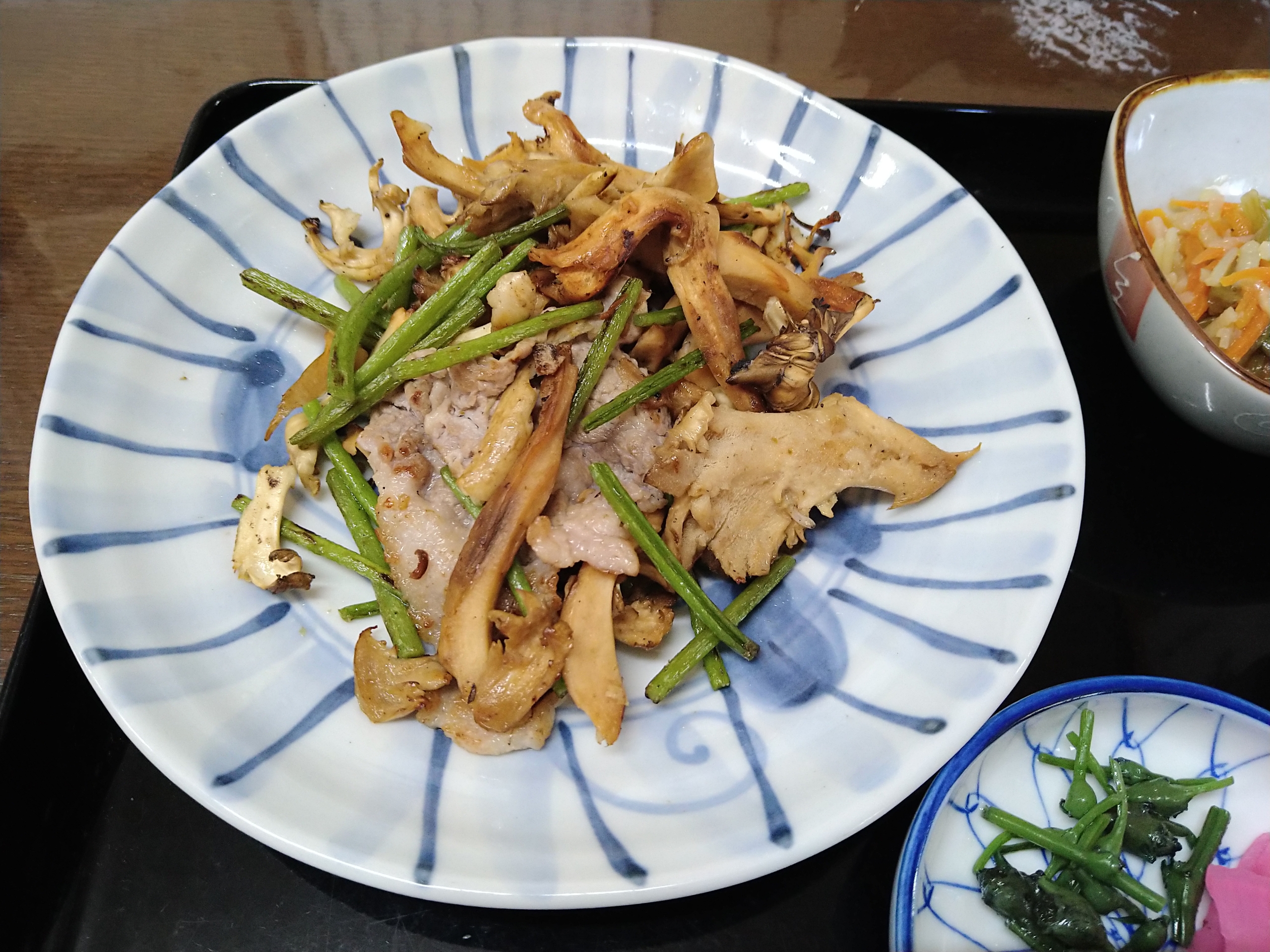 天然舞茸炒め定食(1800円)を注文〜 舞茸炒めに小鉢2品・ご飯・味噌汁・漬物が付いています。小鉢はサツマイモの蔓の炒め物と山で採れたキノコの煮物でどちらも素朴な味わいでメチャ美味しいです。