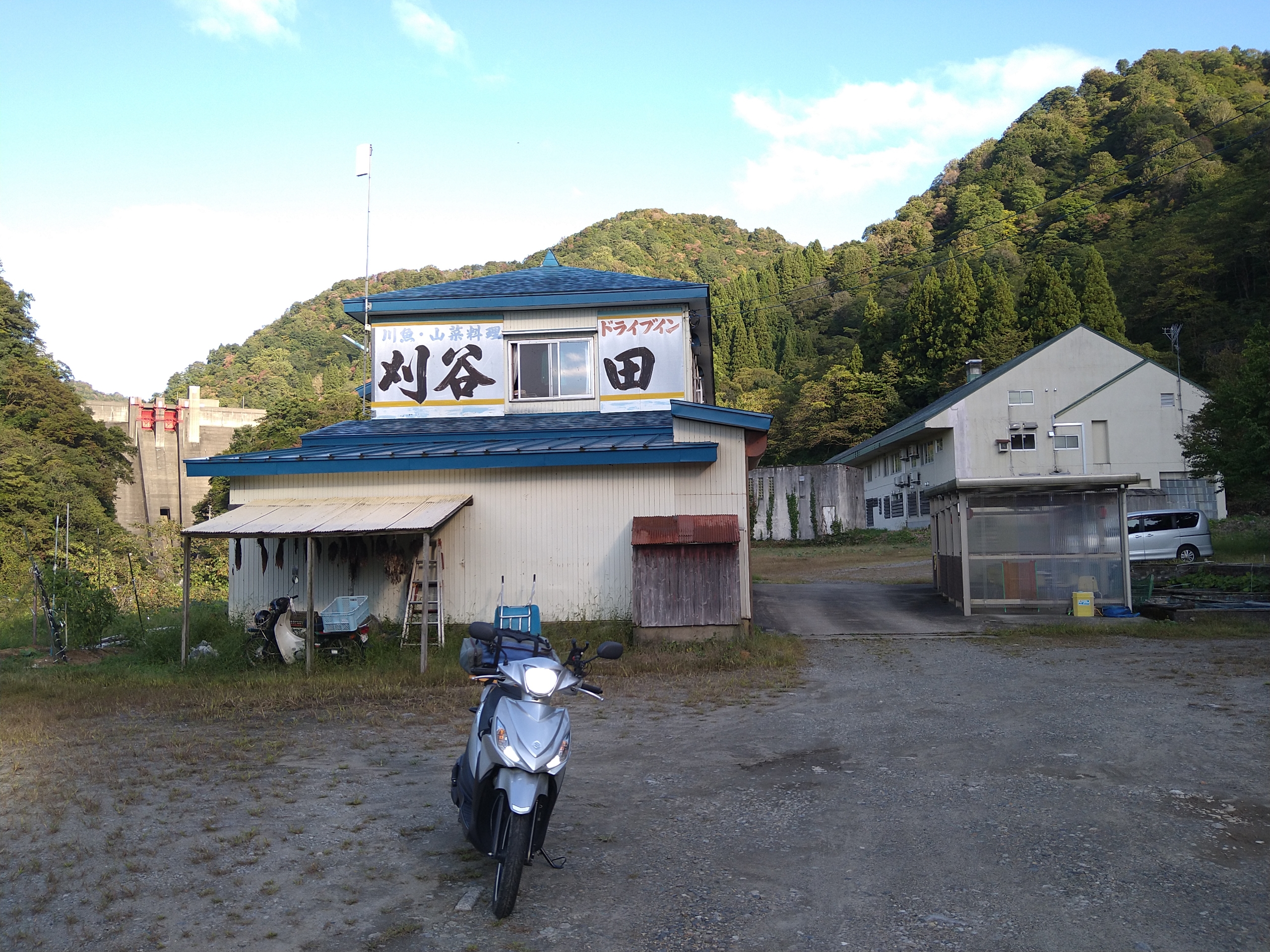 ドライブイン刈谷田は刈谷田川ダムのすぐ下にあり、写真の左に見えるのが刈谷田川ダムです。