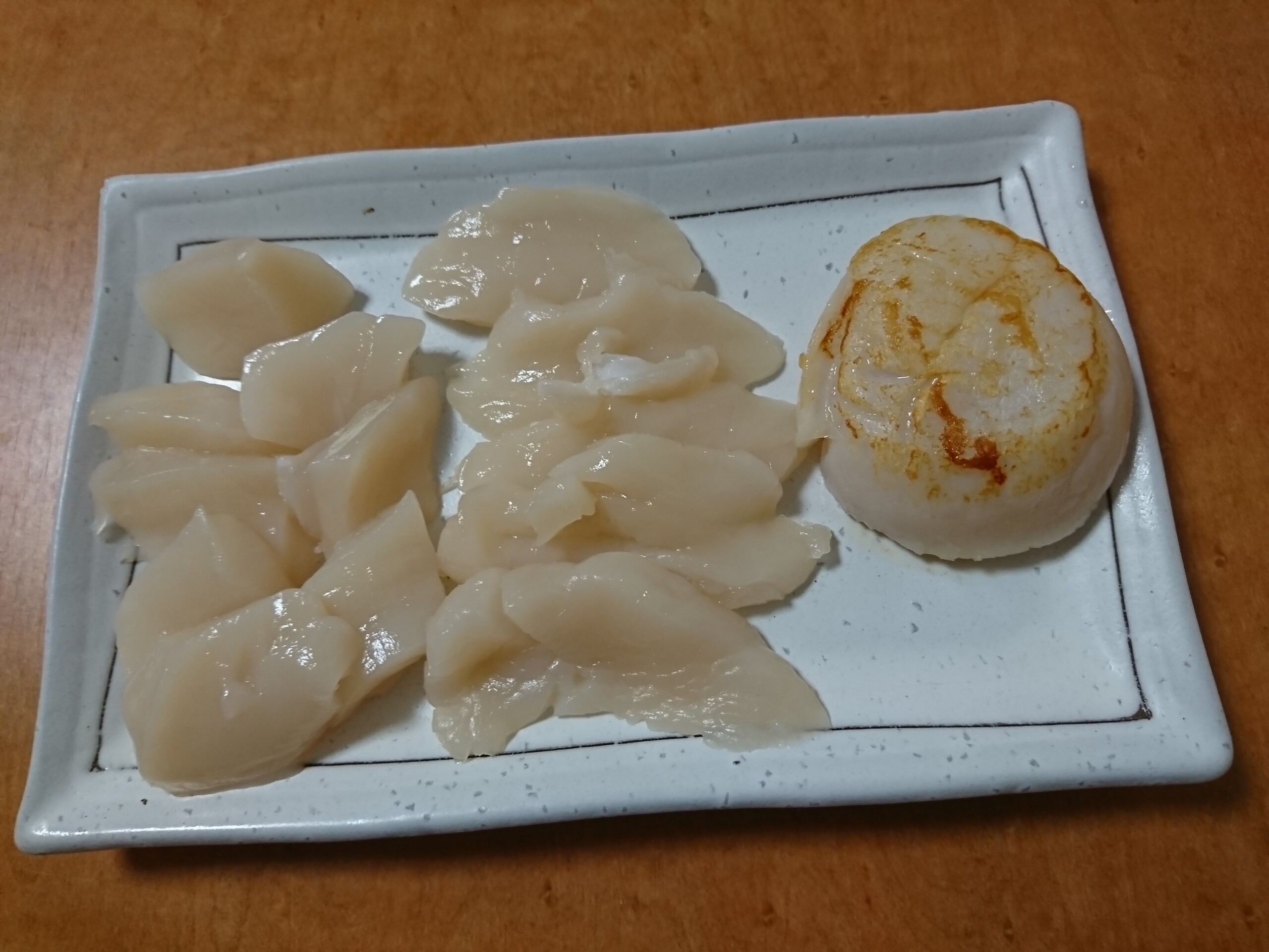 とりあえず今日は3つを解凍して食べました。生食用なのでもちろん刺身で頂きます!1つは角切りにしてもう一つはスライスしてもう一つはフライパンで表面だけを軽く焼きました。まずは生で食べた方はねとっとした食感に甘味と濃い旨味があってメチャ美味しい〜 1個403円もしますが美味過ぎる! 軽く焼いた方は食感が少し繊維っぽく感じ始めましたが、甘味と旨味が生に比べて格段増してこれらも格別でメチャ美味しく最高でした!さすが値は値ですね。スーパーの安いホタテの貝柱は水っぽくて旨味が少なく比べ物にならないです。これはお薦め美味い!