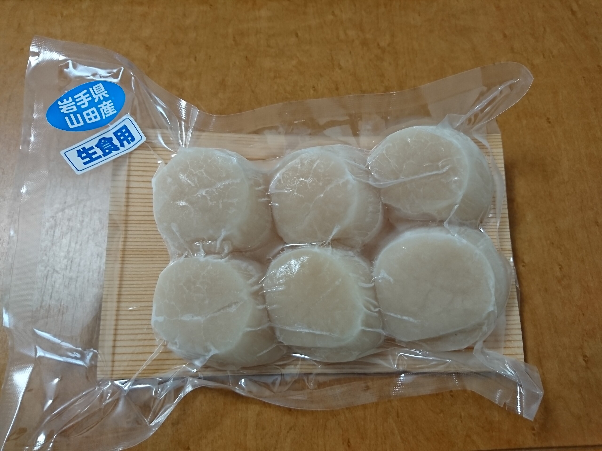今日の酒の肴は岩手県山田町産の大粒のホタテ貝柱です。6個入りで2420円と結構高価でしたが奮発しました。^^