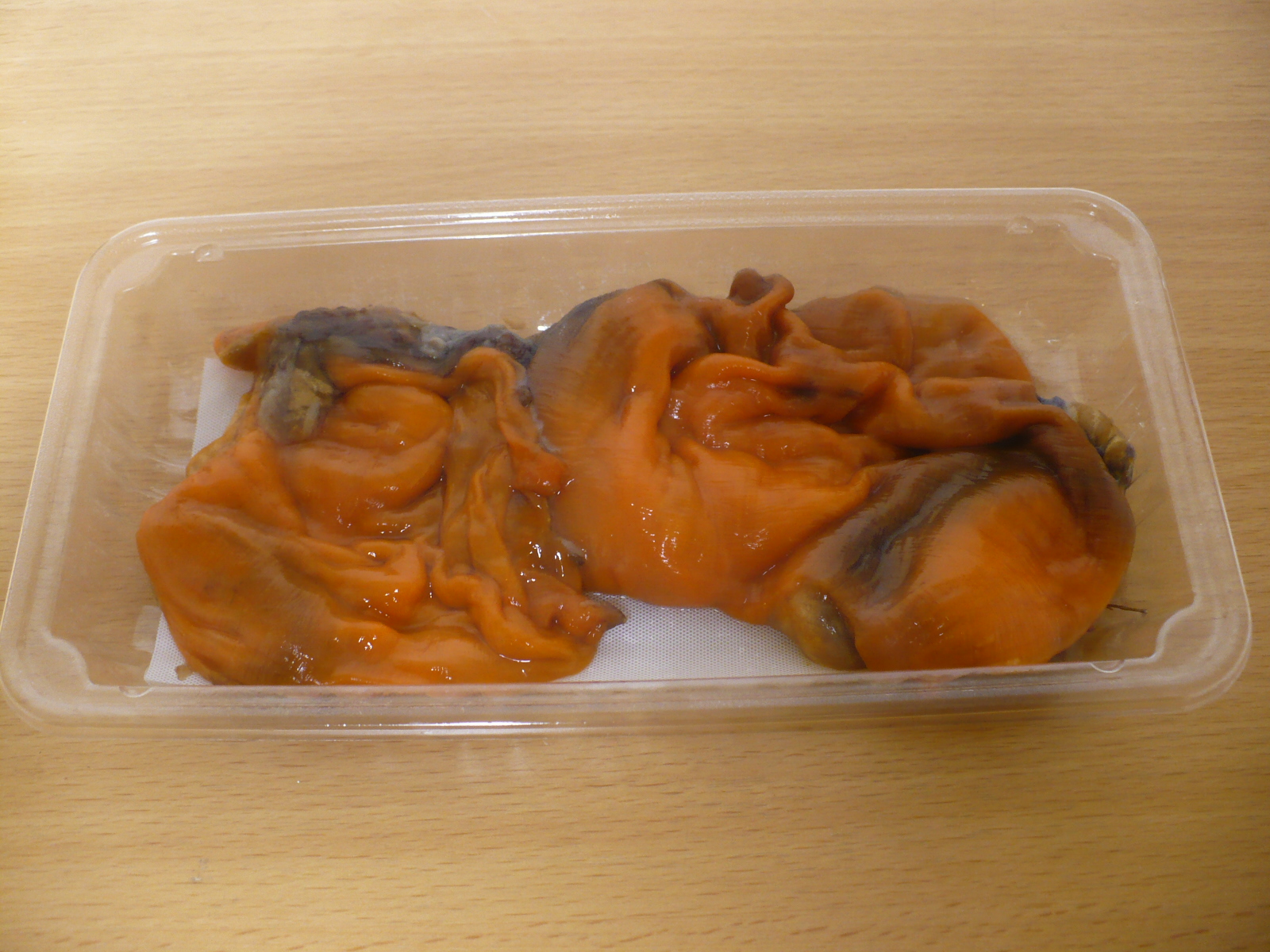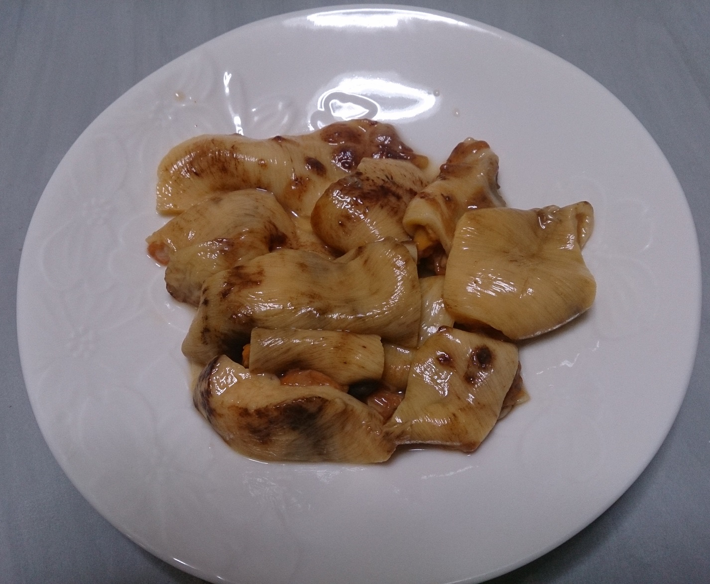 さばいてみたら少し黒ずんでいて、色合いがあまり良くありませんでした。まぁ1個90円だからB級品なのかも知れないですが、ポン酢をつけて食べるとホヤ独特の磯臭さにほのかな甘みがあって美味しかったです。