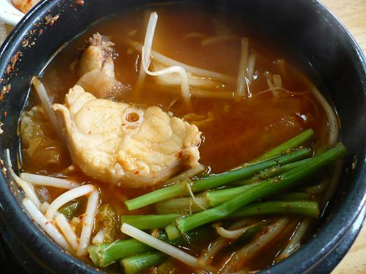 そして「오리매운탕」(オリメウンタン)を注文した!オリメウンタンは、鴨肉を入れて辛く煮込んだ、スープです!この店はオリメウンタンが安くて人気がある店で5000ウォンで食べる事ができます。味はメウン(辛い)タン(スープ)と書いて字の如くさすがに辛い!そしてスープの上澄みが、てかってるのが画像を見れば分かると思うが、コレは溶けた鴨の脂でフーフーして冷まさずに勢い良く口に入れると口の中が絶対火傷するので気をつけましょう〜^^ でも鴨の脂って意外にサッパリとしていてしつこくないんです。香ばしくて甘みがある様な感じで・・・ 鴨肉は柔らかく噛めば肉から甘みが出てきて美味しく、鴨肉の甘み唐辛子の辛いスープがマッチして美味しかったです!でもこの時、熱くて2箇所も口の中を火傷してしまった・・・ (T_T)