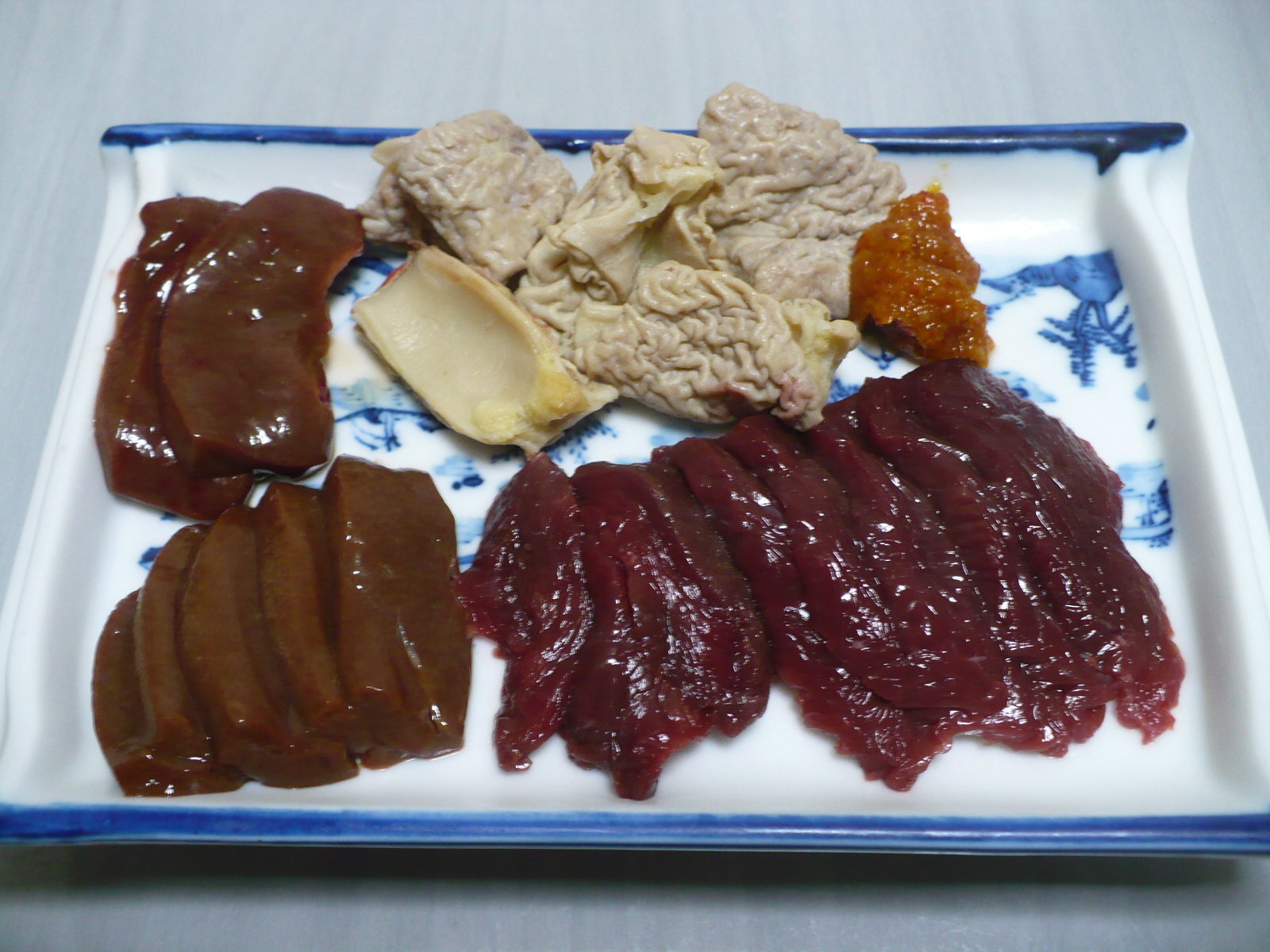 今日の酒の肴は猪名川町にある中元かしわ店で買った、地鶏のレバーと心臓です。どちらも新鮮なので生で刺身で頂きます。ごま油に塩を入れて食べると最高に美味く日本酒によく合います。