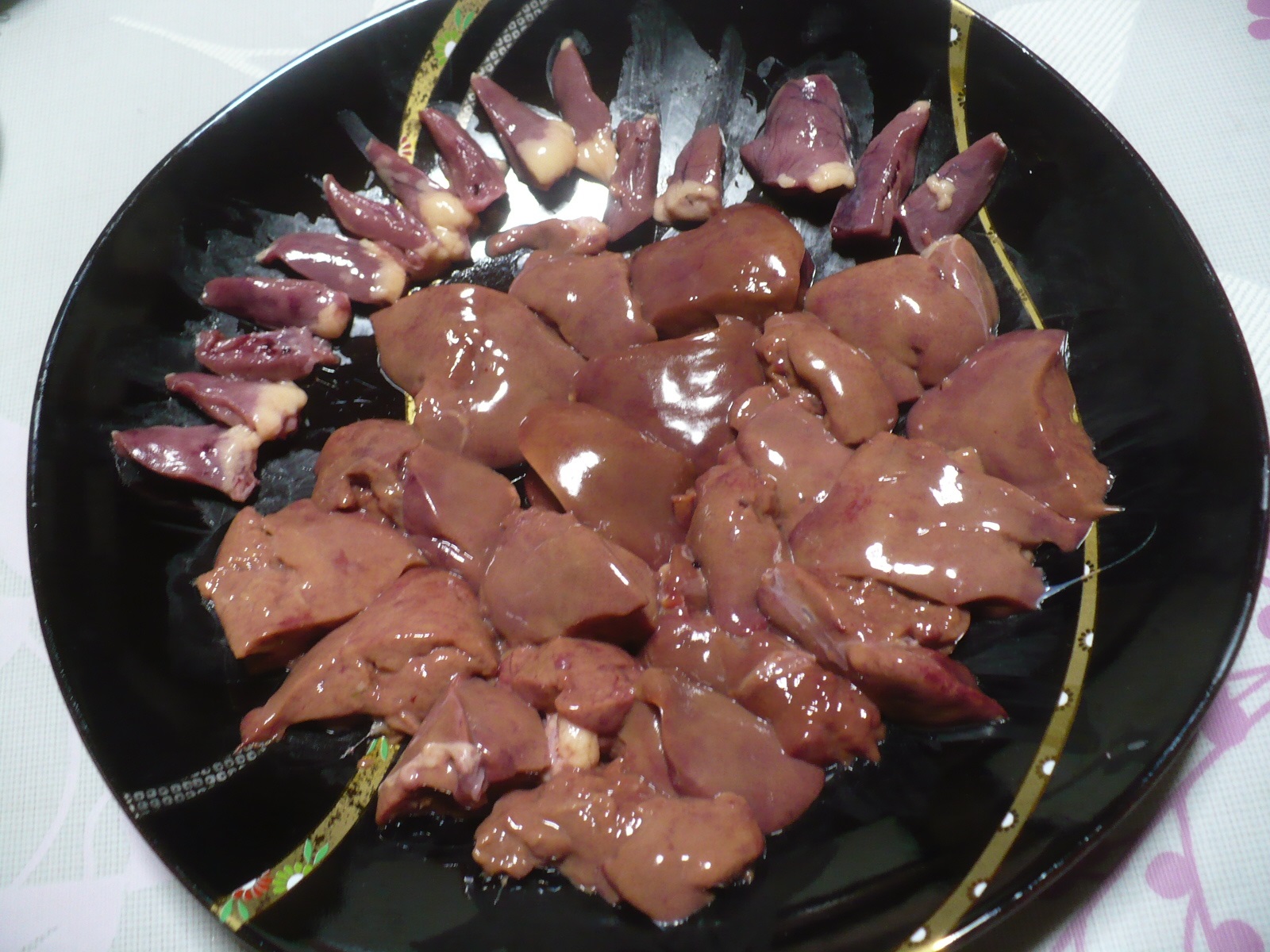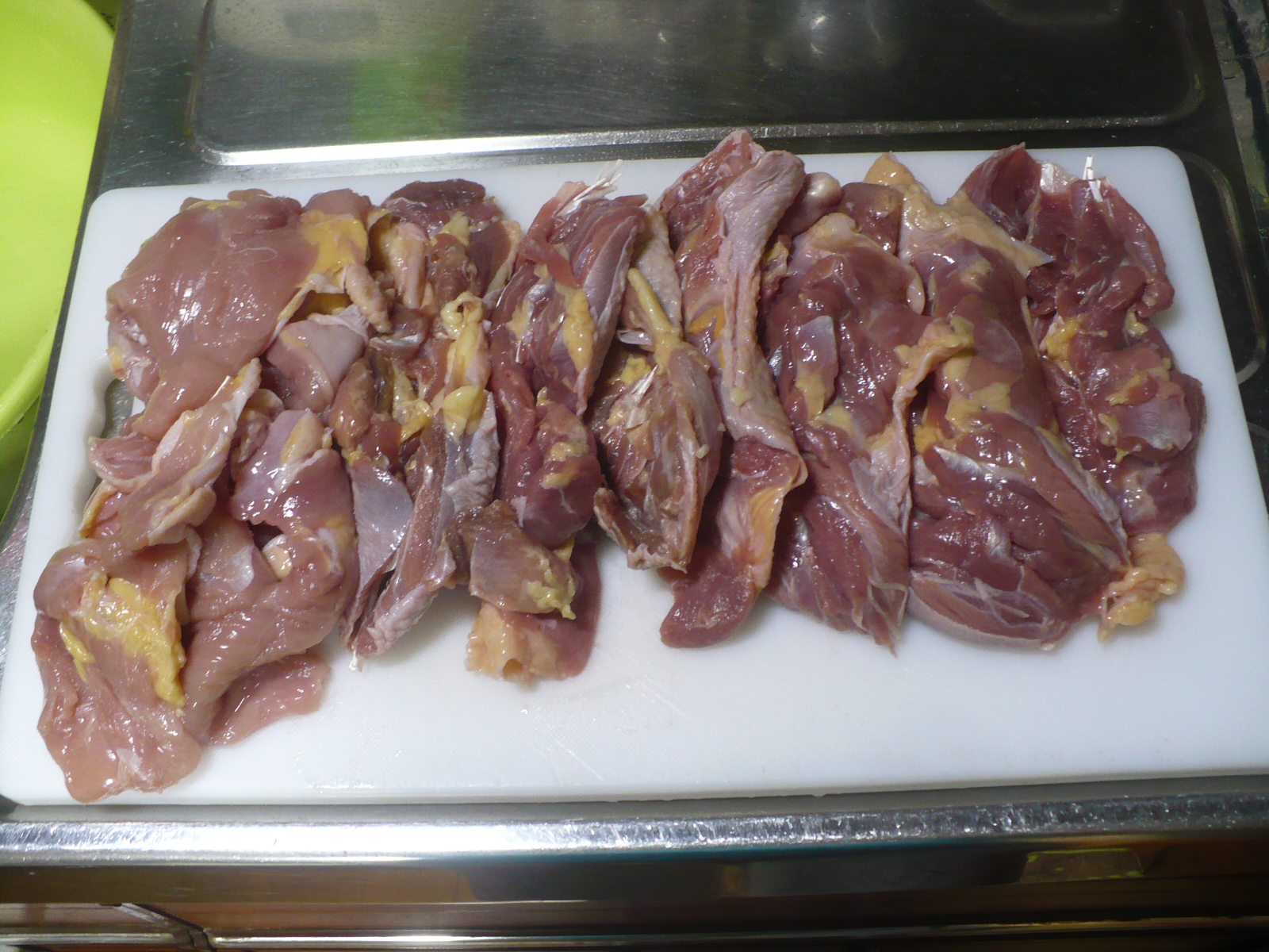 鶏肝(レバー)はさばいて取り出したままなので、レバーに心臓が付いています。レバーが赤くないのは、今回は脂肪が多めの(脂肪肝ぎみ)の白肝を譲ってもらいました。