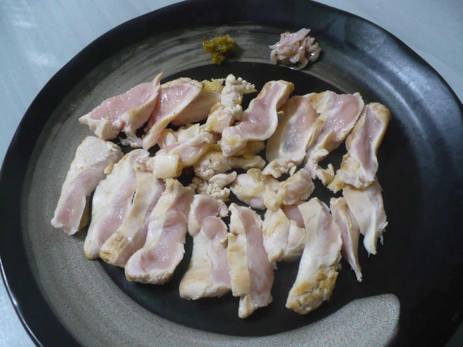 砂ズリも水洗いしペーパーで水分をしっかりと取って筋を剥がしスライスして、柚子胡椒やワサビ醤油で頂きます。