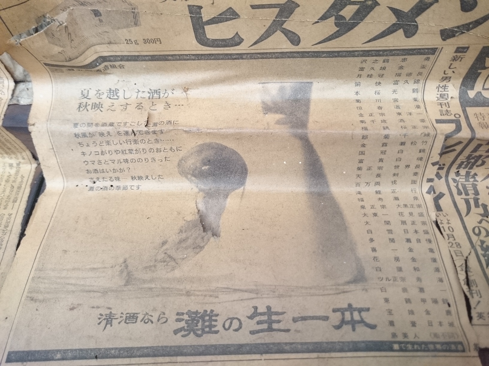 タンスの内側に新聞紙が貼り付けられていて、その中に灘五郷酒造組合の広告がありました。新聞の日付は昭和41年10月20日木曜日でした。この当時で灘五郷酒造組合に加盟する酒蔵は65蔵もあったんですね。伏見の月桂冠をはじめ、和歌山の大東一・日本城、岐阜の菊川、滋賀の金亀など数多くの地方の酒蔵が灘に進出していたのが伺えます。時代の流れと阪神大震災の影響も受けて現在では灘五郷酒造組合加盟の酒蔵は26蔵とかなり減り、西宮市内の中小の酒蔵に限っては自醸蔵がほとんど無い状態ですが、これからも頑張って欲しいですね。
