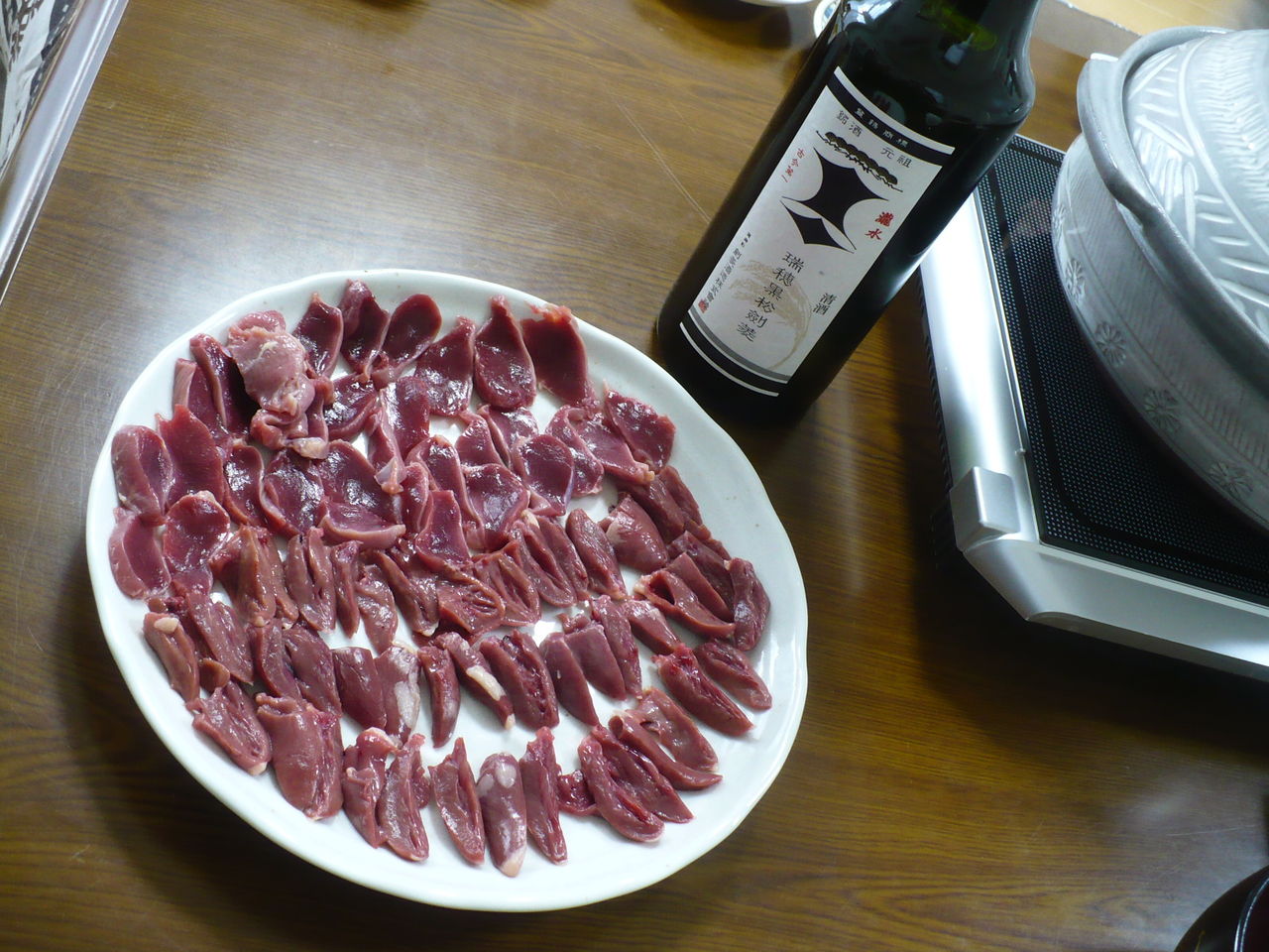 今日の酒の肴は猪名川町にある中元かしわ店で買った、地鶏のレバーと心臓です。どちらも新鮮なので生で刺身で頂きます。ごま油に塩を入れて食べると最高に美味く日本酒によく合います。