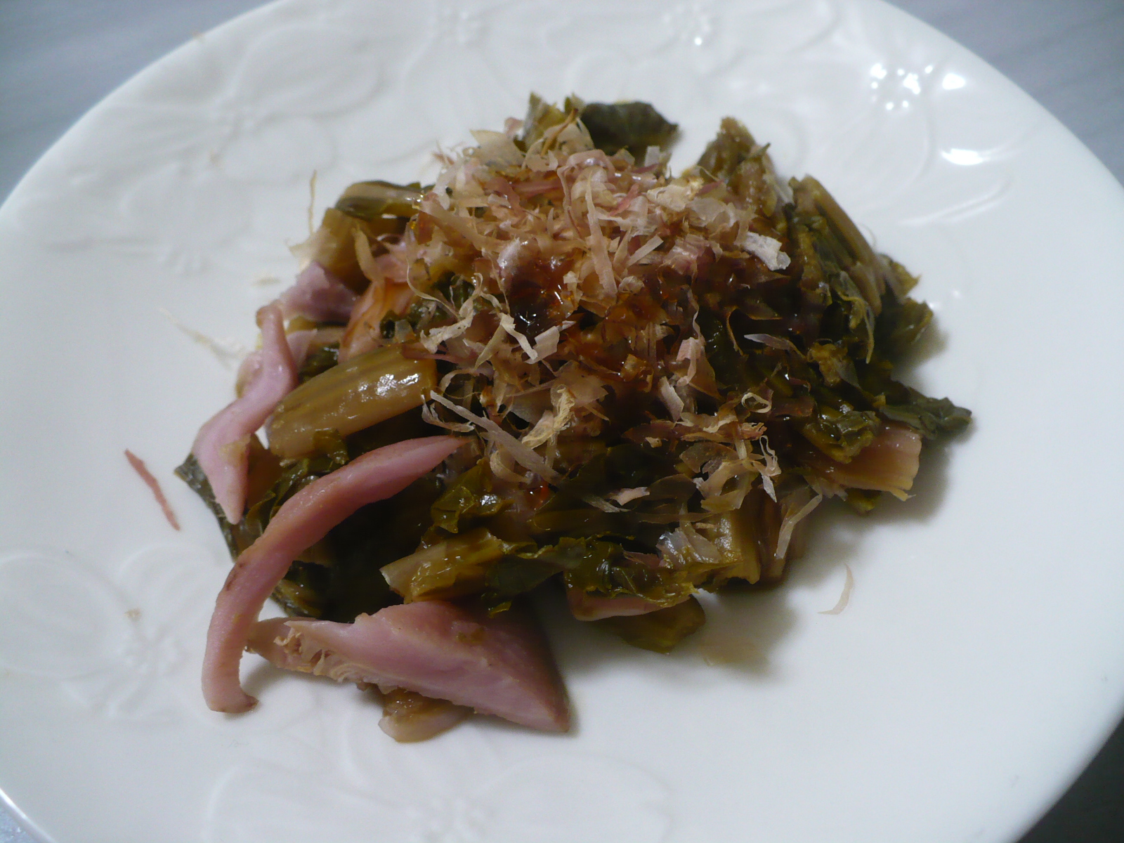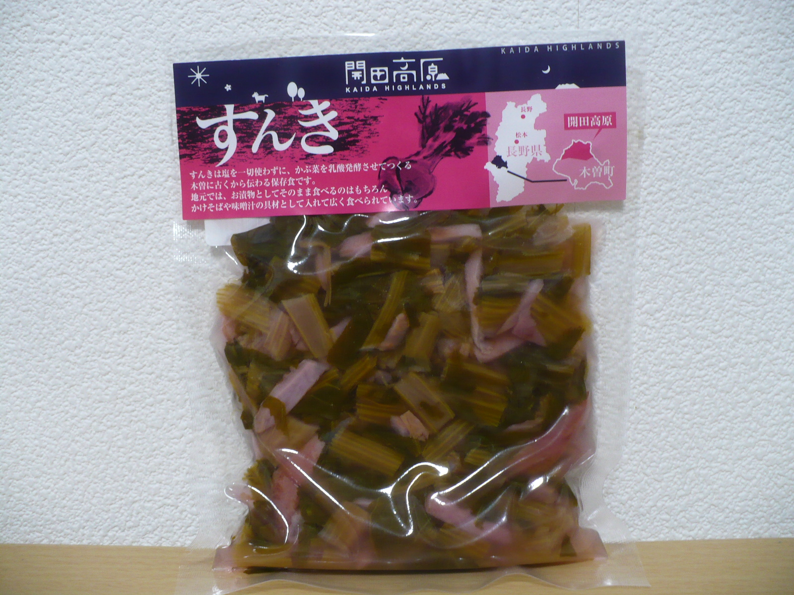 すんき漬は、そのままご飯のおかずや酒の肴・お茶請けとして食べますが、無塩乳酸発酵の為、味が付いていないので鰹節に醤油をかけて頂きます。しゃきしゃきとした食感に爽やかな酸味があって美味しく、植物性乳酸菌を多く含むのでカラダにも良いらしいです。