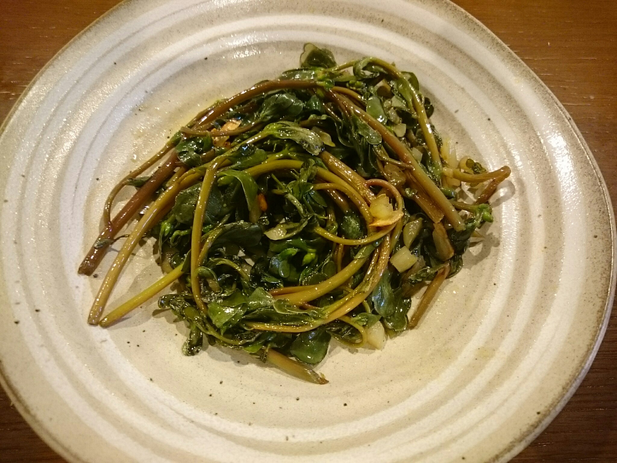 今日の酒の肴はオリーブ油でニンニクのみじん切りとスベリヒユを炒めて塩胡椒で味付けした、スベリヒユの油炒めです!独特の酸味がありますが、ニンニク・オリーブ油との相性が良くとても美味しかったです。これはお勧めのスベリヒユ料理かもしれませんね。気になる方は是非チャレンジしてみて下さい。^^