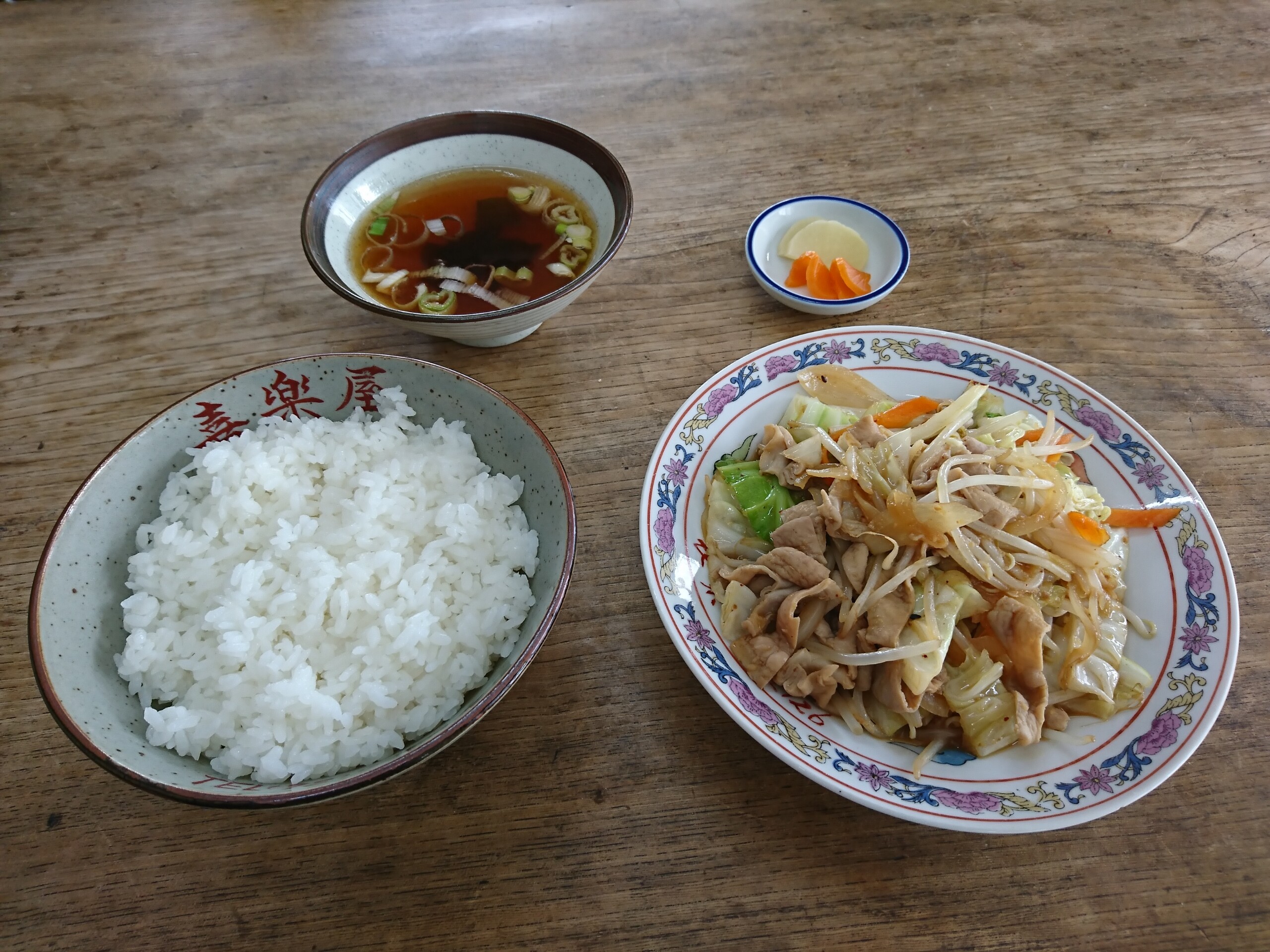 注文したのはもつ定食(800円)で、モツは煮込みではなく炒めなのでメニューに、モツ炒め定食と書いて欲しいですね。^^ まぁ小さく補足で書いてますが・・・ もつ定食はモツ炒めにご飯・ラーメンのスープと漬物が付いています。