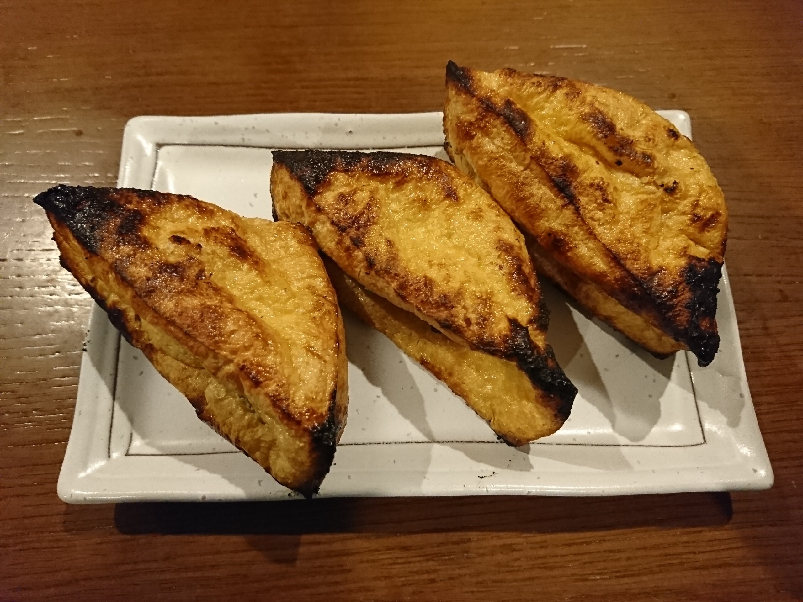 油揚げに切れ目を入れて中にネギを詰めて焼いて生姜醤油で食べました。こんがりと焼けて香ばしく生姜醤油に良く合って美味しい〜