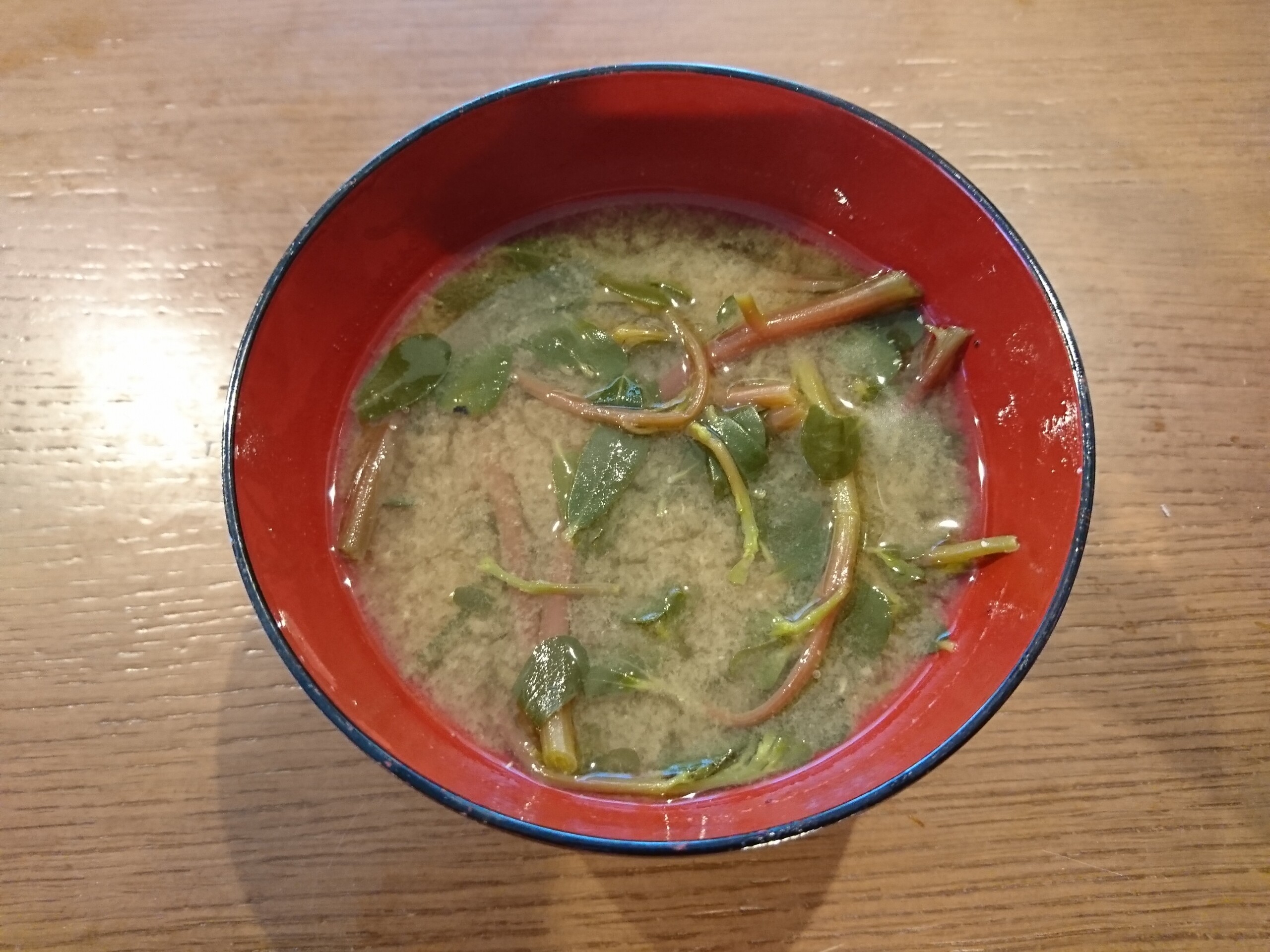 3品目 飲んだ後の〆にスベリヒユの味噌汁です。 スベリヒユにはリンゴ酸が含まれていて、味噌汁に爽やかな酸味がプラスされ青臭さもありますが結構美味しかったです。