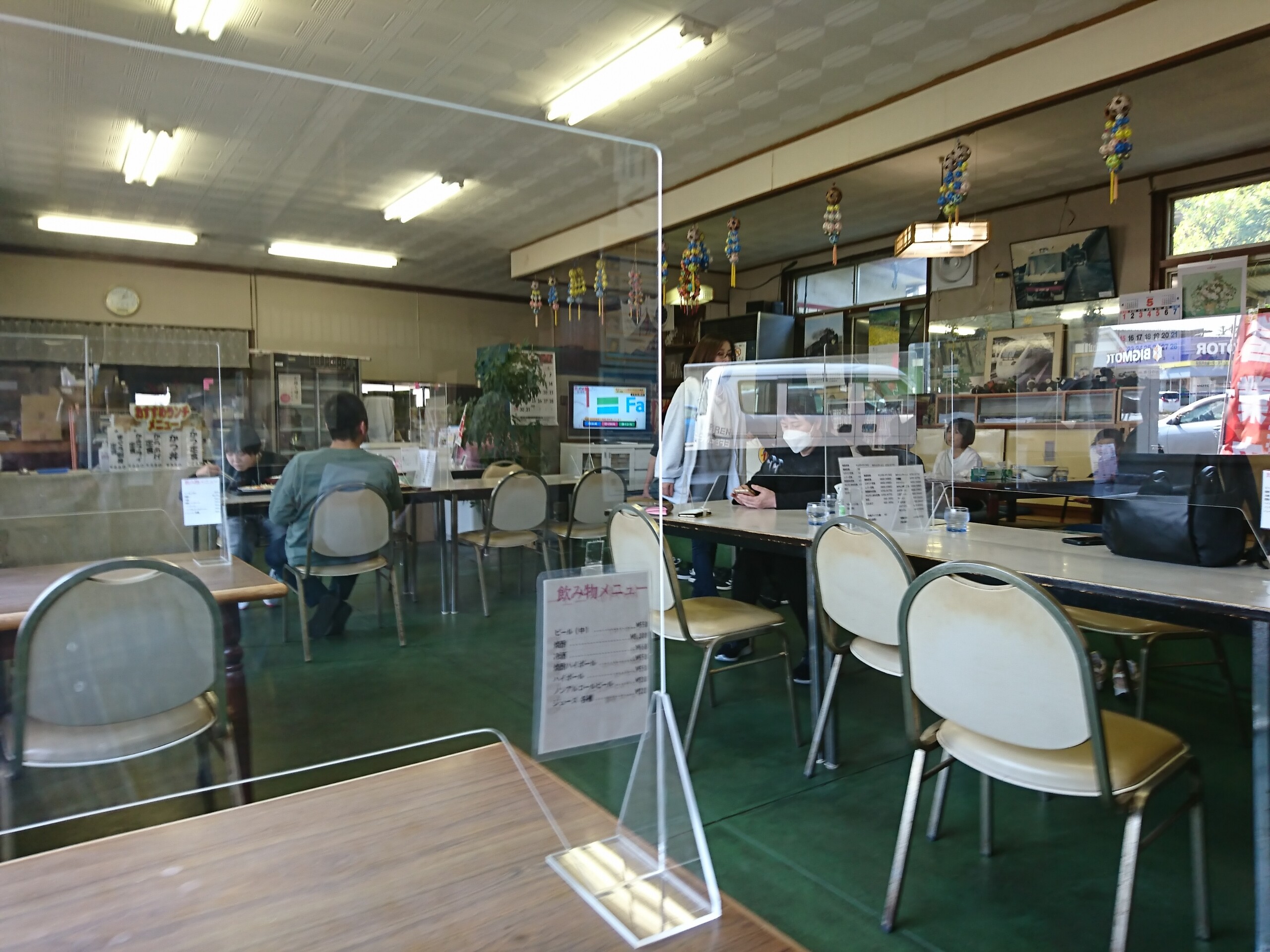 店の内観です。パネルが各テーブルに設置されコロナ対策に力が入れられてました。座席は4人掛けのテーブル席が7席に座敷にはテーブルが3席ありました。