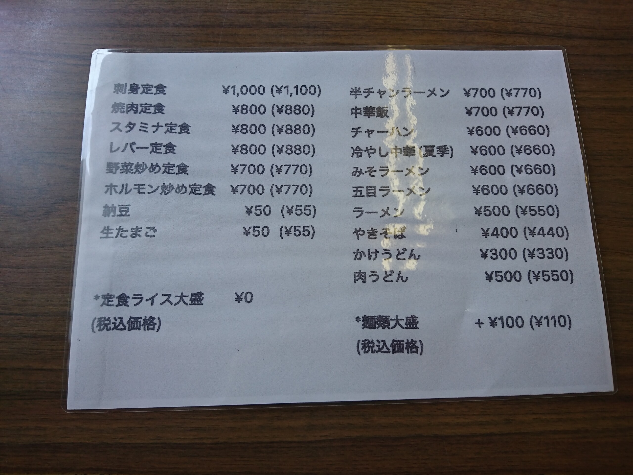 メニューです。定食に麺類・焼飯などありますが種類は少なめです。値段が結構安くかけうどん330円・焼きそば440円は安い!そして定食のライス大盛が無料なのも嬉しいですね。