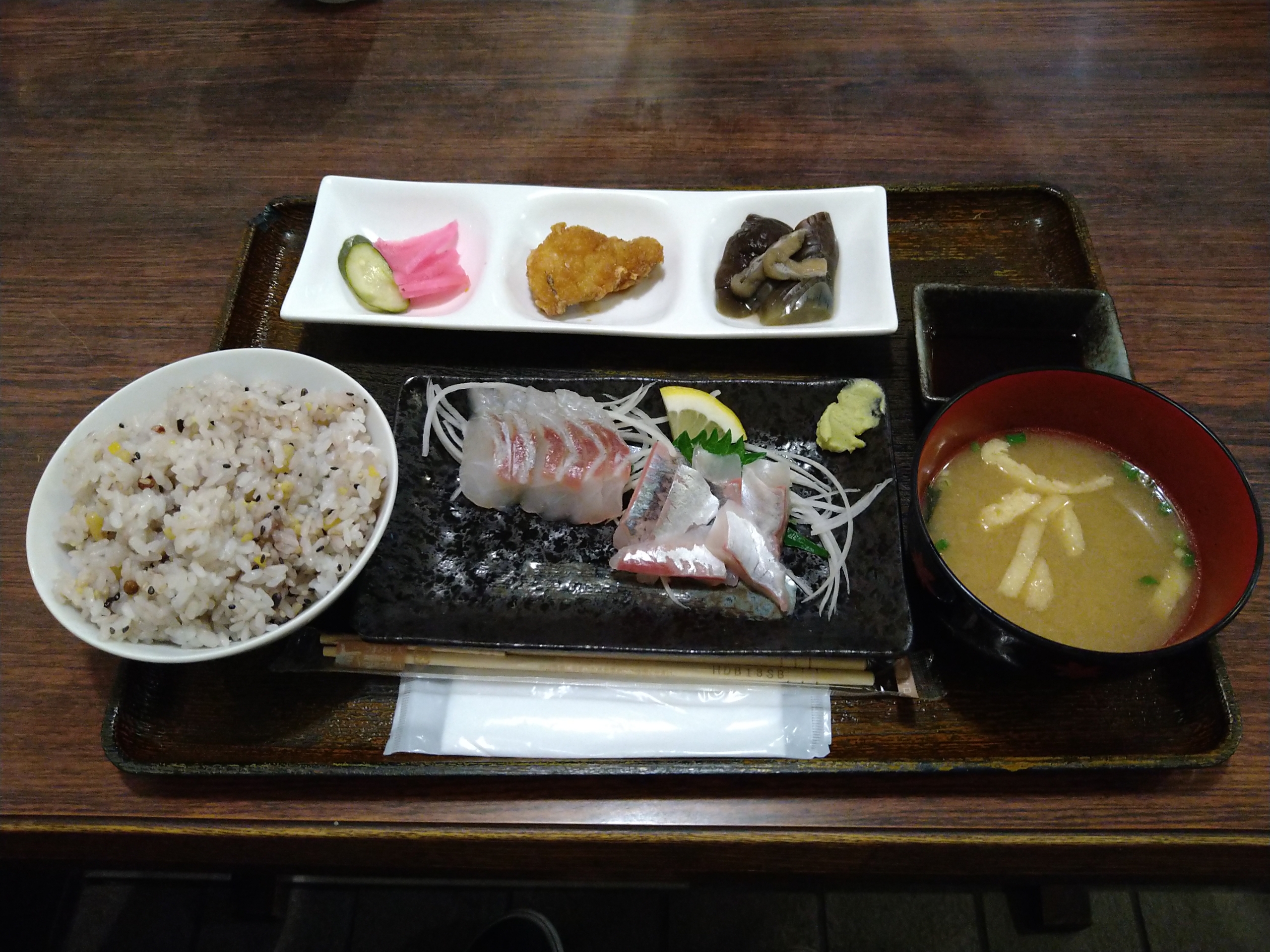 注文したのは刺身定食(700円)です。刺身に雑穀米と味噌汁・小鉢と漬物が付いています。ご飯は白米と雑穀米から選択できます。