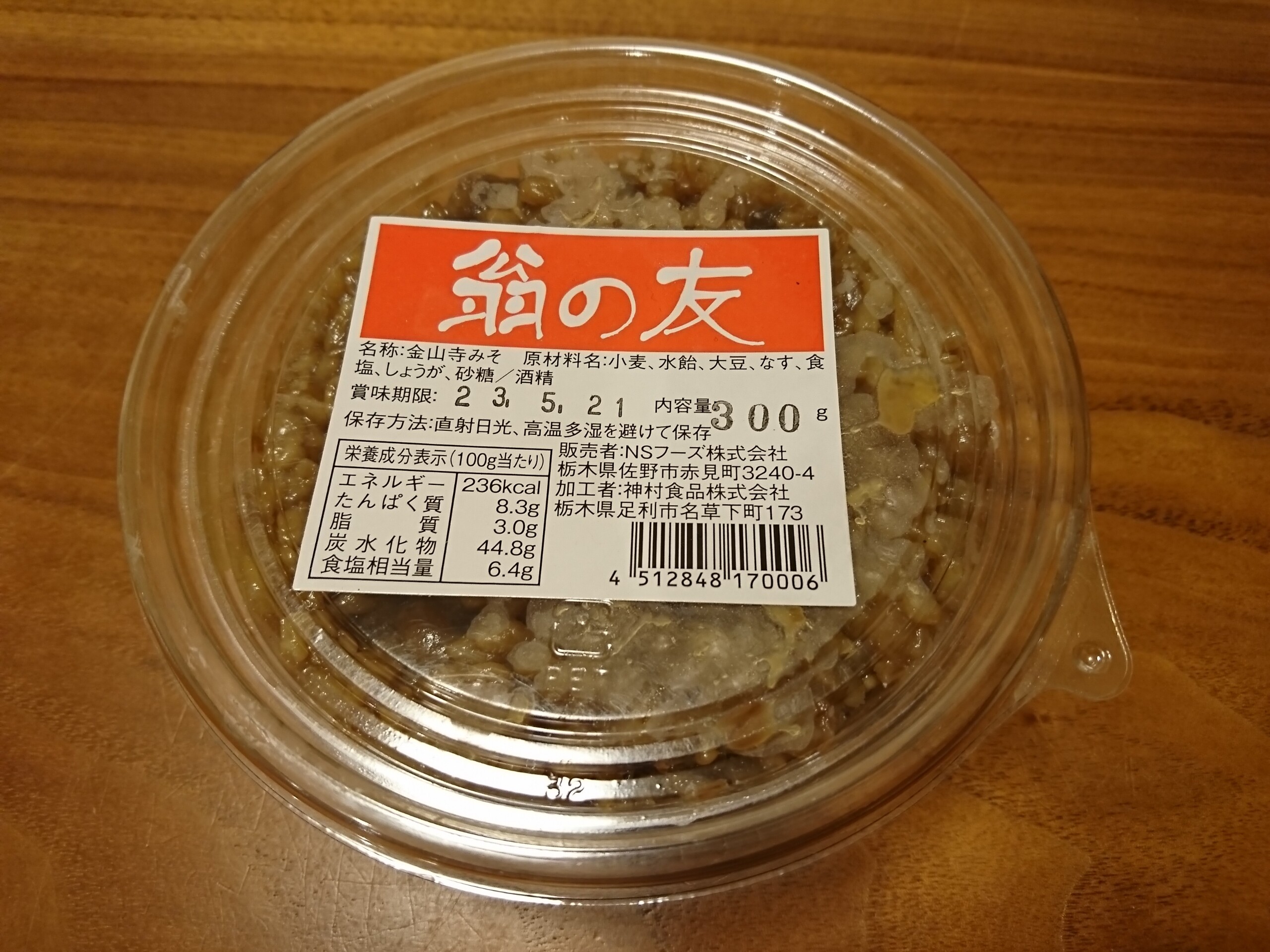 今日の酒の肴は私が大好きな金山寺味噌!名前は翁の友 販売者は栃木県佐野市のNSフーズと言う会社で加工者は足利市の神村食品となっていますが、じゃあ製造者はどこやの?って思ってしまいますね。