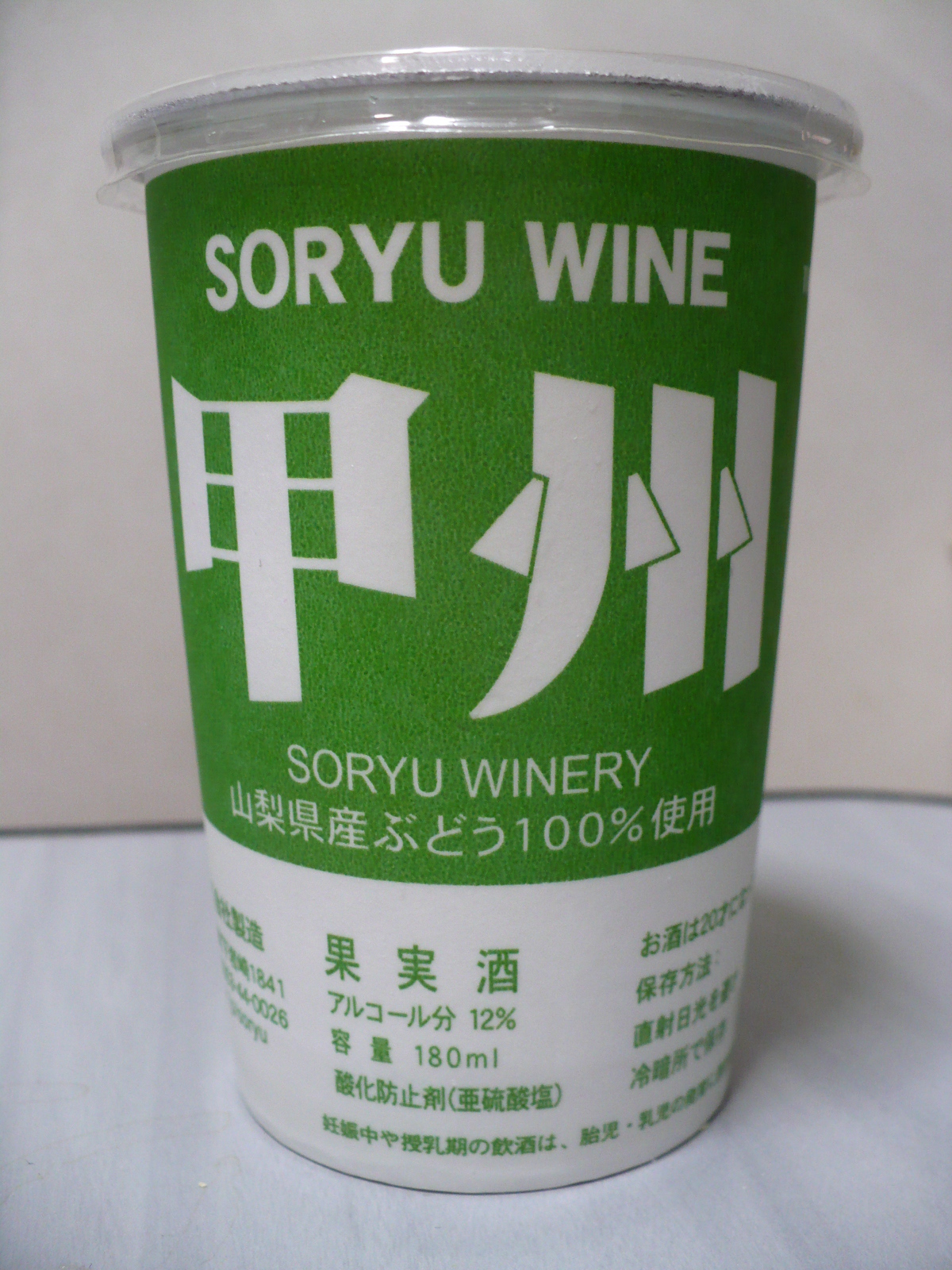 今日は山梨県を旅行した時に道の駅・にらさきで360円で購入した勝沼町のワイナリー・蒼龍葡萄酒(株)の白ワイン「SORYU WINE 甲州」を少し冷やして飲みました。このカップワイン地元で取れた甲州ぶどうを100%使用していて、飲んだ感想はぶどうの香りがやや高く辛口で適度な酸味があり、後味はほのかに甘く感じ飲みやすく、あまりワインを飲まない私でも美味しく頂けました。日本酒のカップ酒に比べるとワインのカップは値が張りますが、少しだけ飲みたい時や旅行に携帯するには便利ですね。