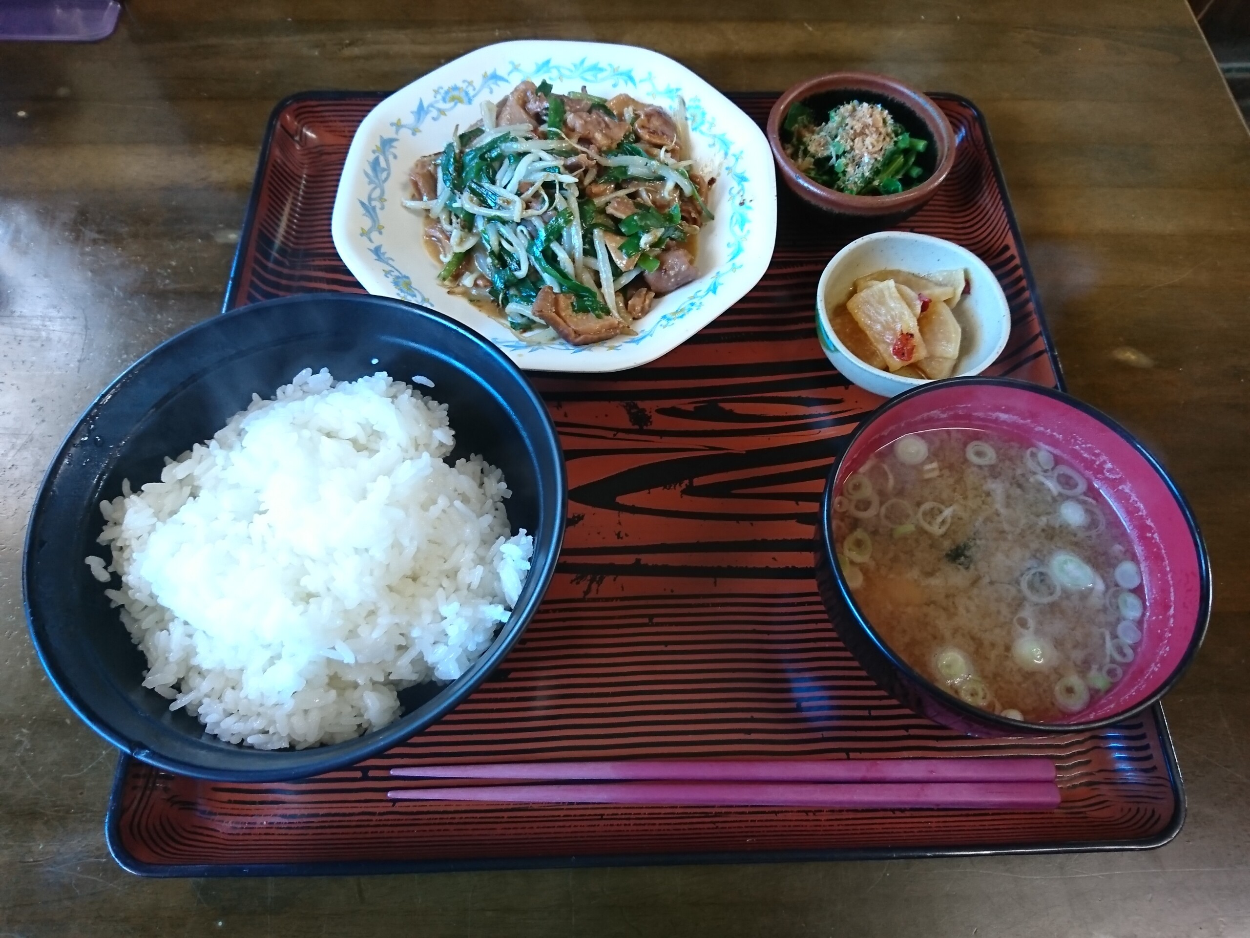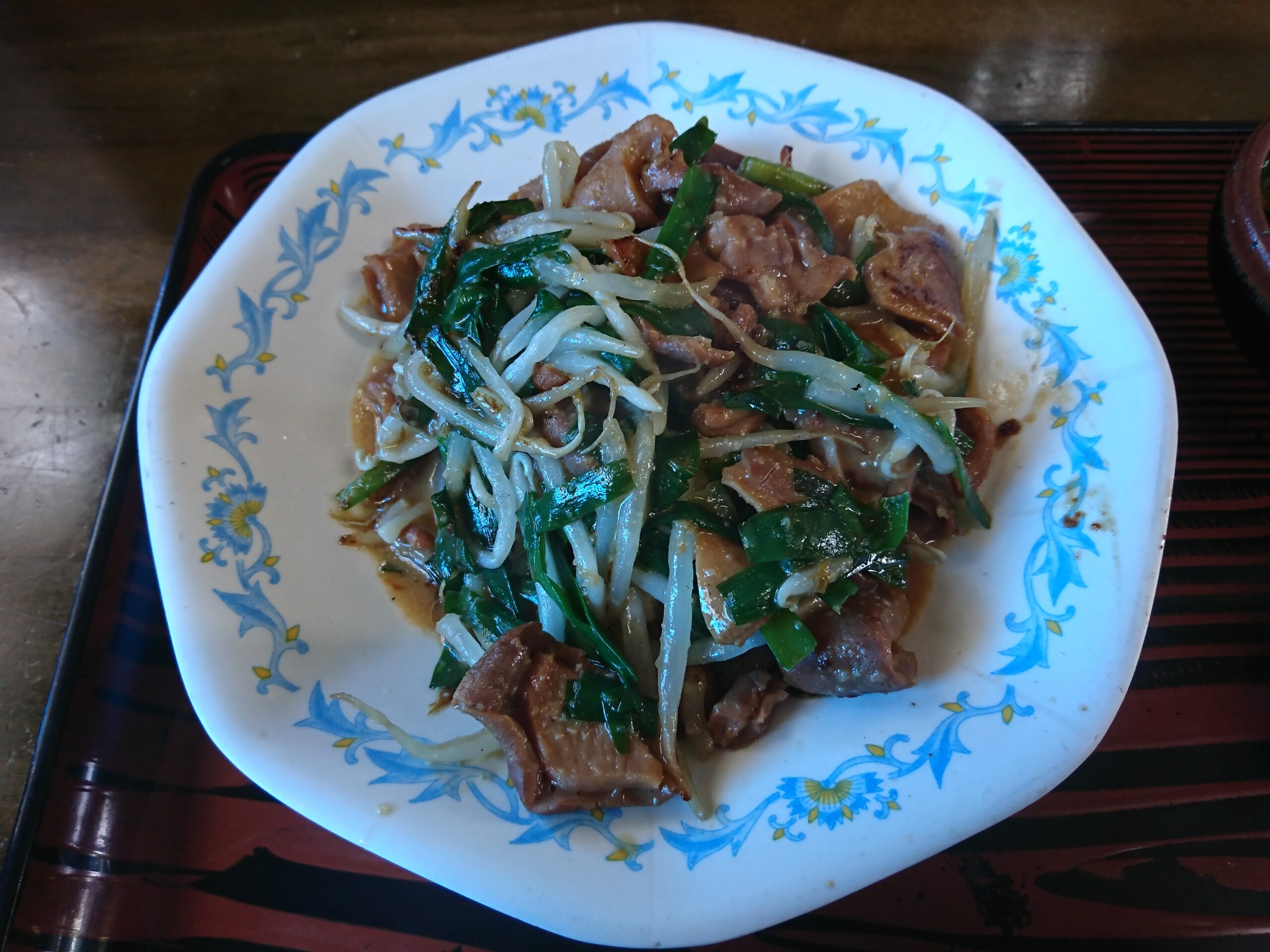 今日は肉鍋が食べれないから、モツニラ炒め定食(880円)を食べました。時価の焼き魚定食とも迷ったのですが・・・ モツニラ炒め定食はモツニラ炒めにご飯・味噌汁・ほうれん草のお浸し・大根の油炒めが付いていて量はご飯・おかず共に普通サイズですね。