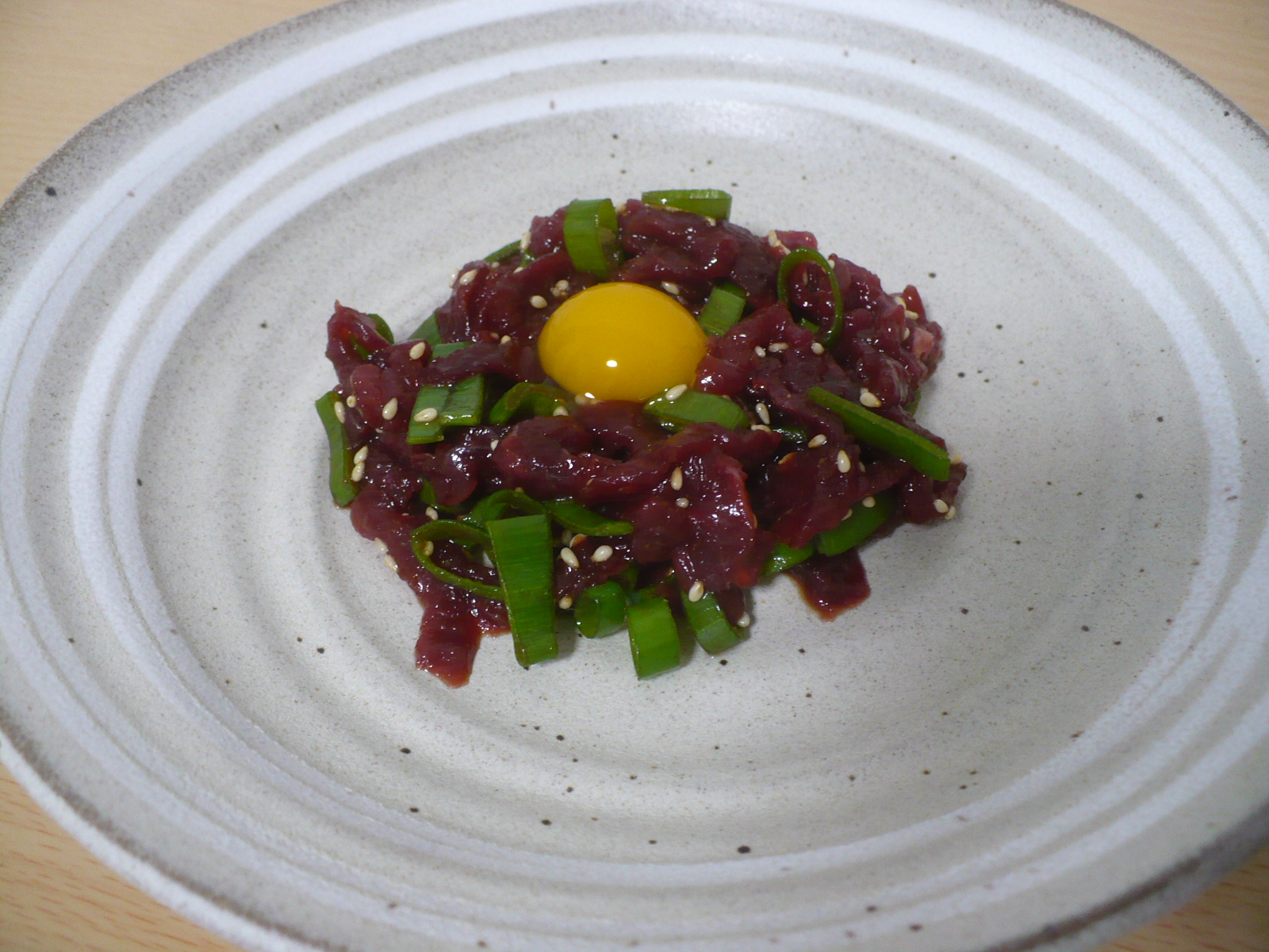 袋から馬肉を皿に移し玉子とネギを添えて付属のタレをかけて完成です。癖の無いサッパリとした馬肉に玉子がマッチしてメチャ美味しかったです。