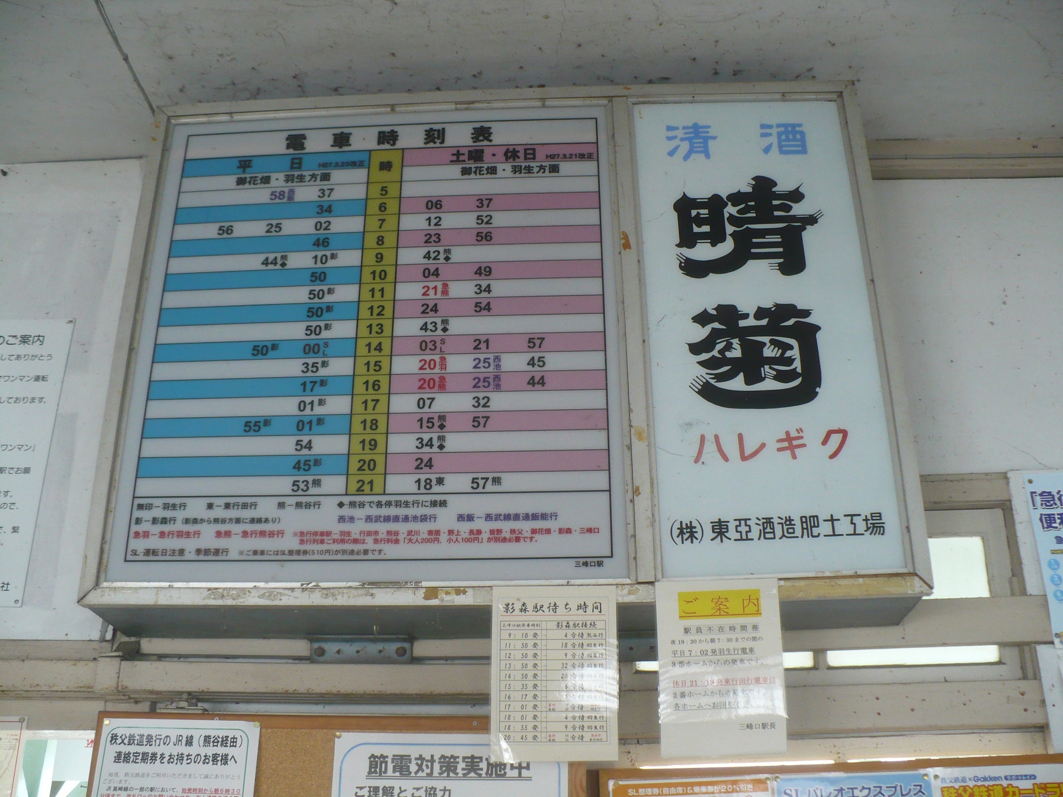 秩父鉄道の三峰口駅の時刻表です。広告は晴菊で、東亜酒造肥土工場と書かれており、かなりの年季を感じます!