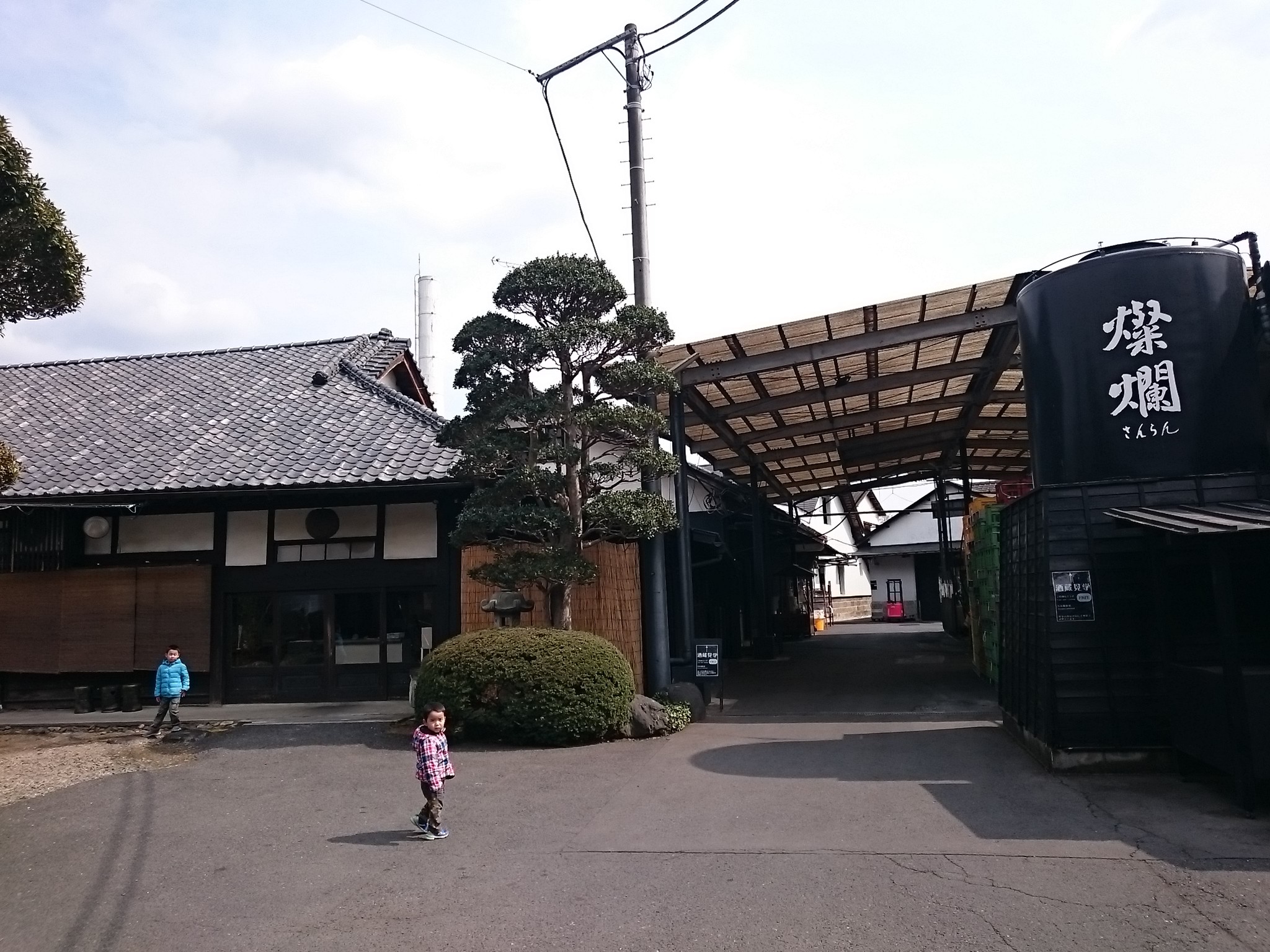 酒蔵で記念撮影〜(^∀^)v でもベンチが高くてこわ〜い(泣)