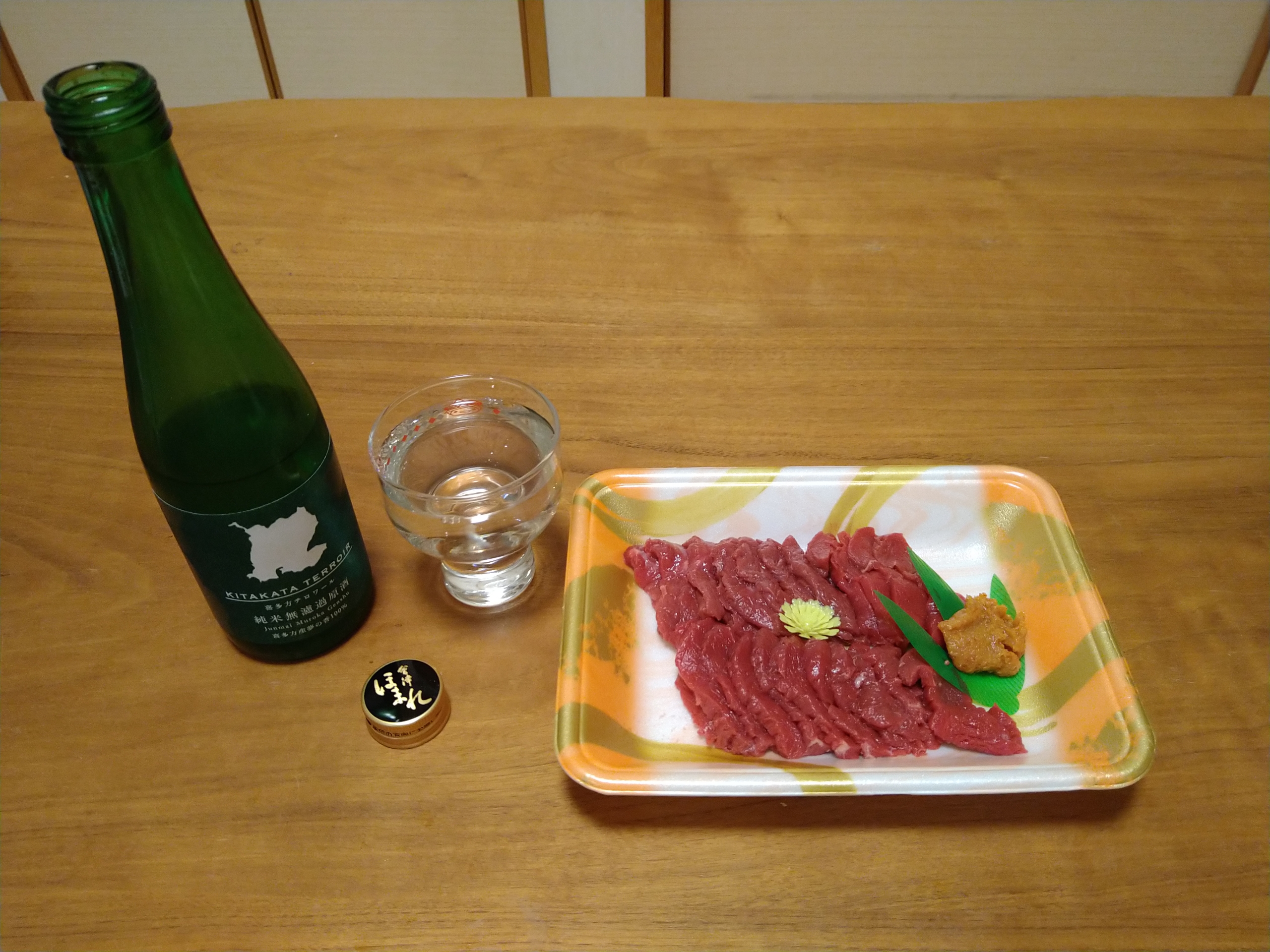 喜多方地酒・喜多方テロワール純米無濾過原酒と肴は喜多方市の杉葉の馬刺し!