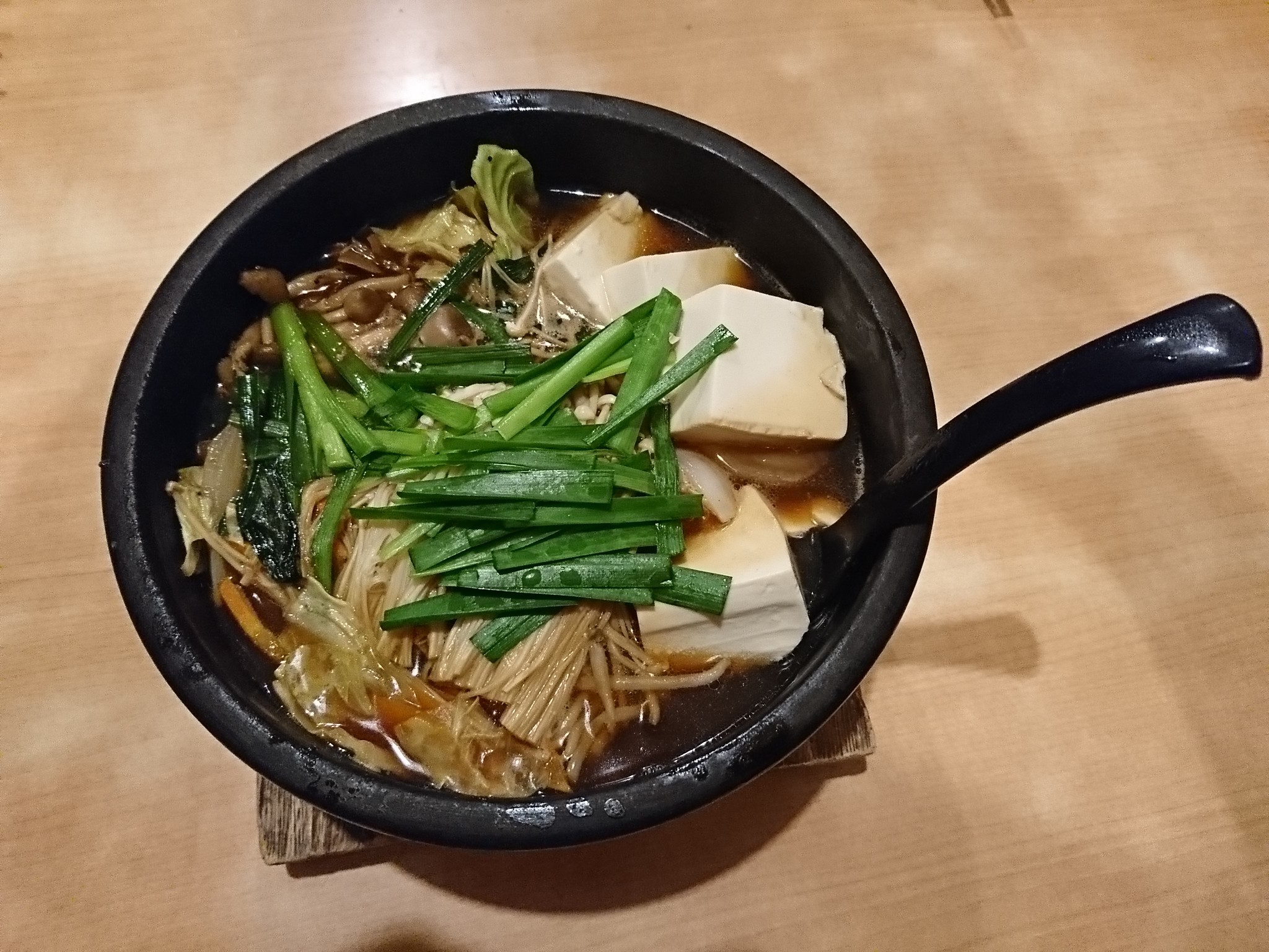 そして注文したのはもちろん!肉鍋定食(900円)です。 肉鍋定食は肉鍋に大盛のご飯・生卵・小鉢と自家製っぽい漬物、そして他店の肉鍋定食には基本付いていない味噌汁がここの肉鍋定食には付いていました。