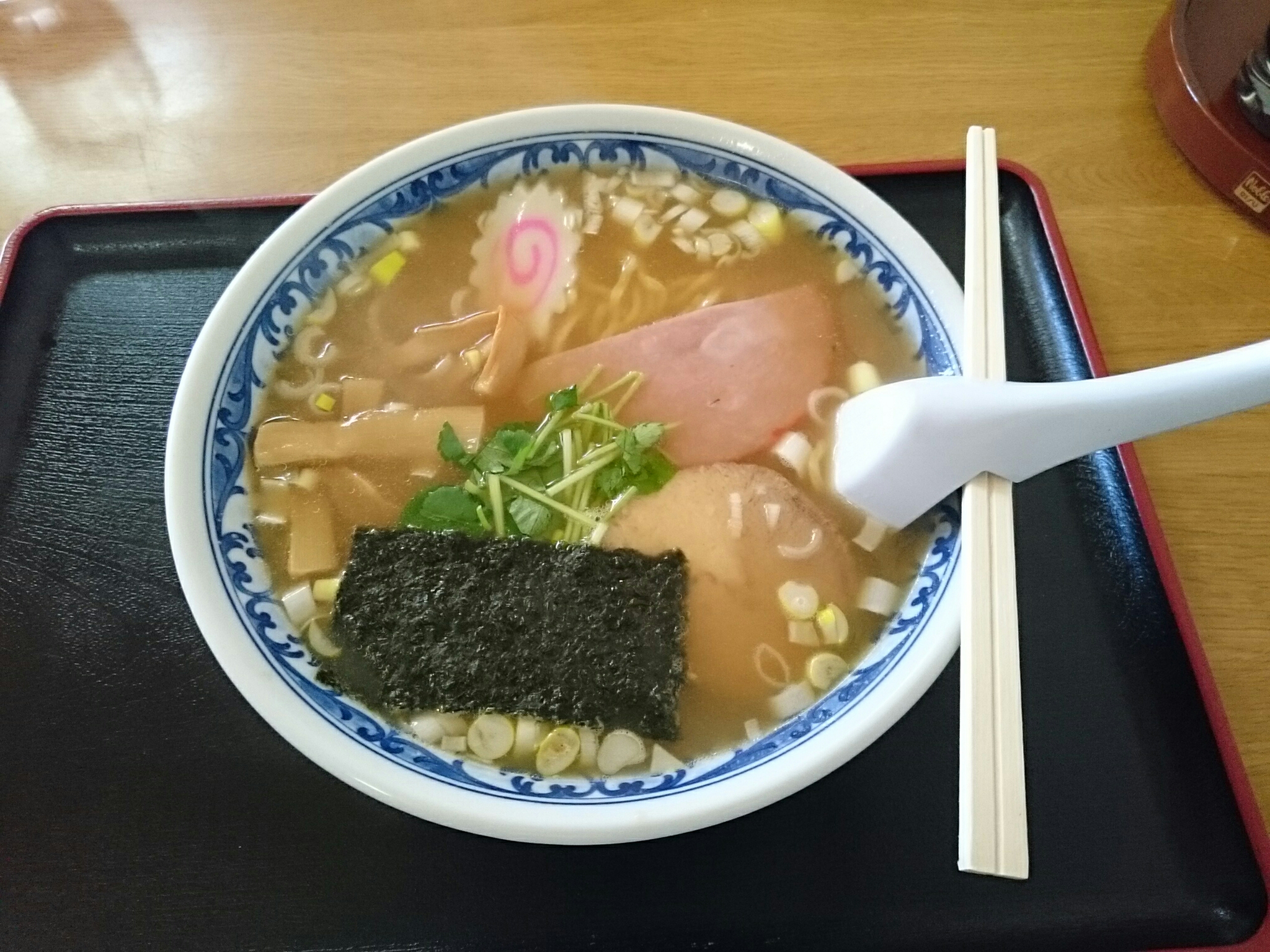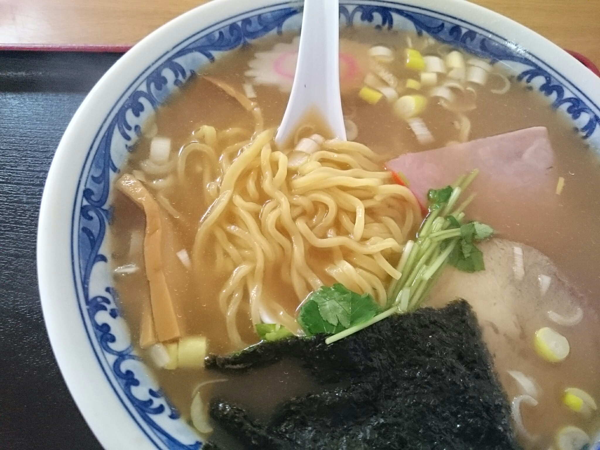 今日食べたのは手打ラーメン(600円)です。普通のラーメンですが、具はチャーシュー・ハム・海苔・メンマ・ナルト・みつば・ネギといろいろ入っています。