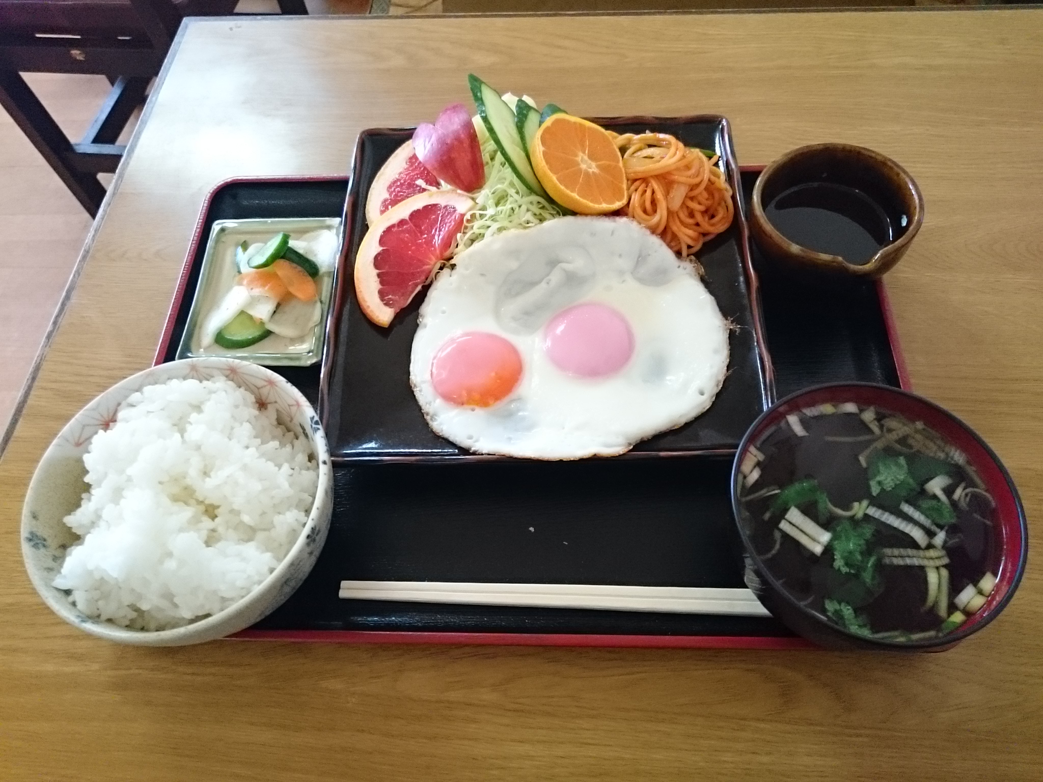 今日食べたのは、目玉焼きライス(650円)です!いまどきでは、ちょっと外食ではありえないメニューですが、昭和からやってる老舗食堂ならではのメニューですね。シンプルに目玉焼きドーン!に、スパゲティー少々、ご飯・吸物・漬物・生野菜・フルーツが付いています。生野菜とフルーツの量が結構多く、栄養バランスも良さそうですね。見た感じ昼食よりは朝ごはん的なメニューですが、素朴で普通に美味しかったです。東宝食堂は11時から開いてるので、目玉焼き定食は「ちょっと遅めの朝食を食べる!」って方には良いかもしれませんね。