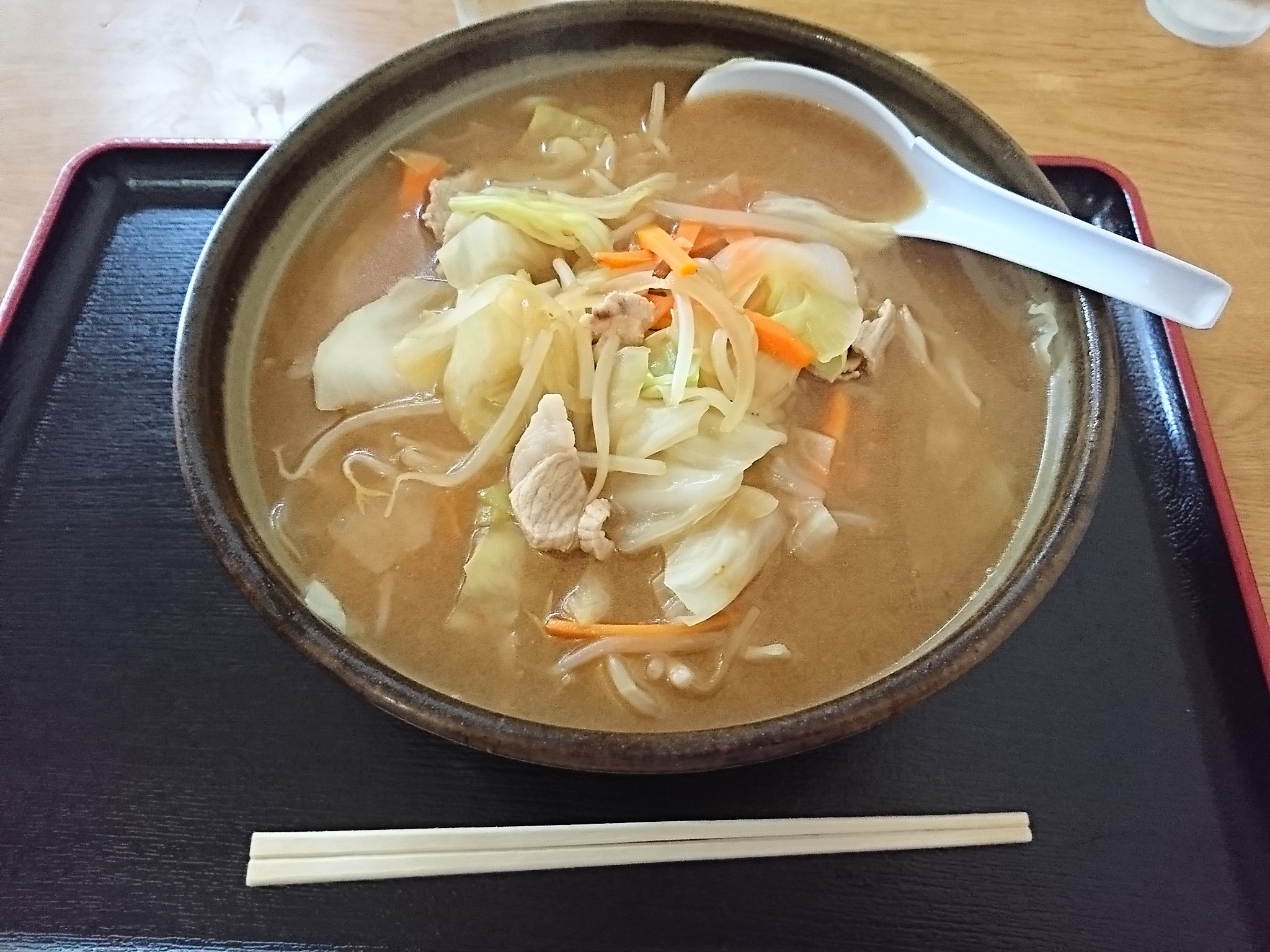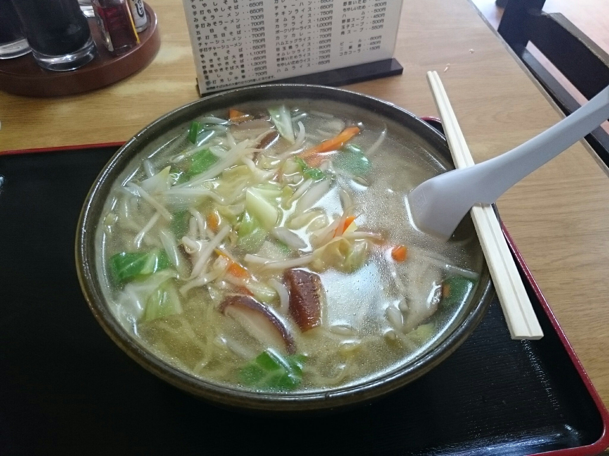 今日食べたのは手打ちタンメン(650円)です。もちもちっとした手打ち麺にあっさりとした塩味のスープが絡みます。具はモヤシ・シイタケ・人参・キャベツがタップリ入ってて具沢山です!また大きな器に入っててスープの量もかなり多く、しかもスープが激熱で舌が火傷するほどでした。でもやさしい味わいでとても美味しかったです。